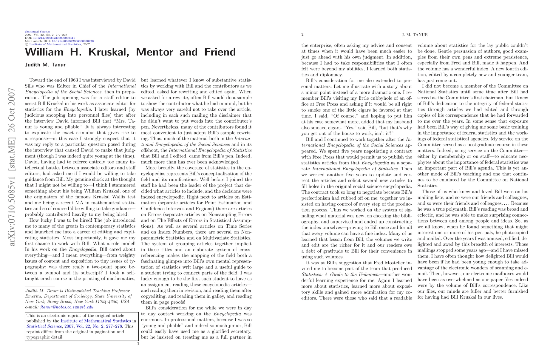 Discussion of ``The William Kruskal Legacy: 1919--2005'' by Stephen E. Fienberg, Stephen M. Stigler and Judith M. Tanur [arXiv:0710.5063]