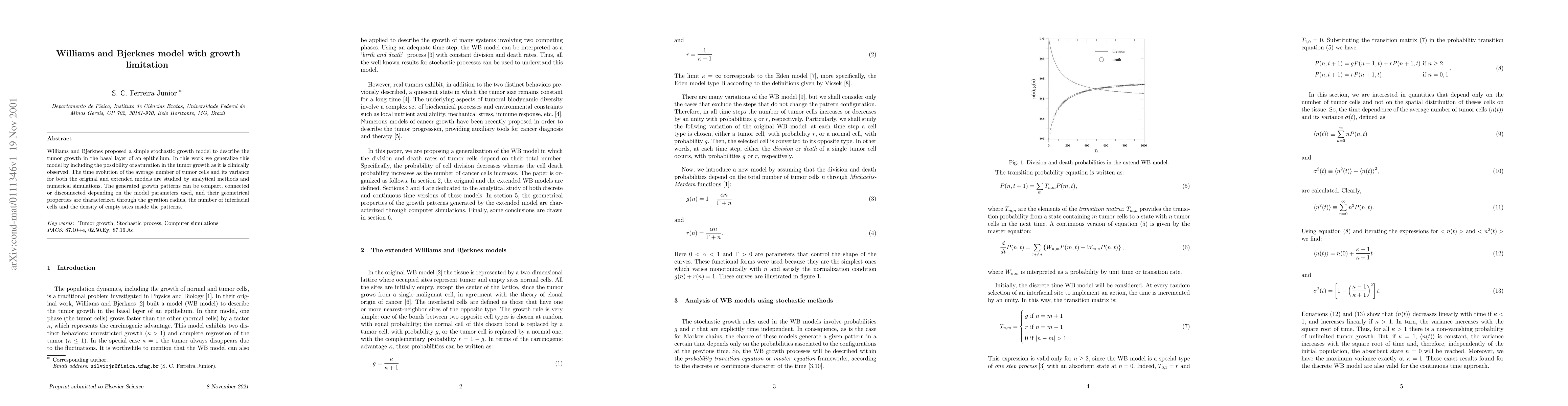 Williams and Bjerknes proposed a simple stochastic growth model to describe the tumor growth in the basal layer of an epithelium. In this work we generalize this model by including the possibility of saturation in the tumor growth as it is clinically observed. The time evolution of the average number of tumor cells and its variance for both the original and extended models are studied by analytical methods and numerical simulations. The generated growth patterns can be compact, connected or disconnected depending on the model parameters used, and their geometrical properties are characterized through the gyration radius, the number of interfacial cells and the density of empty sites inside the patterns.