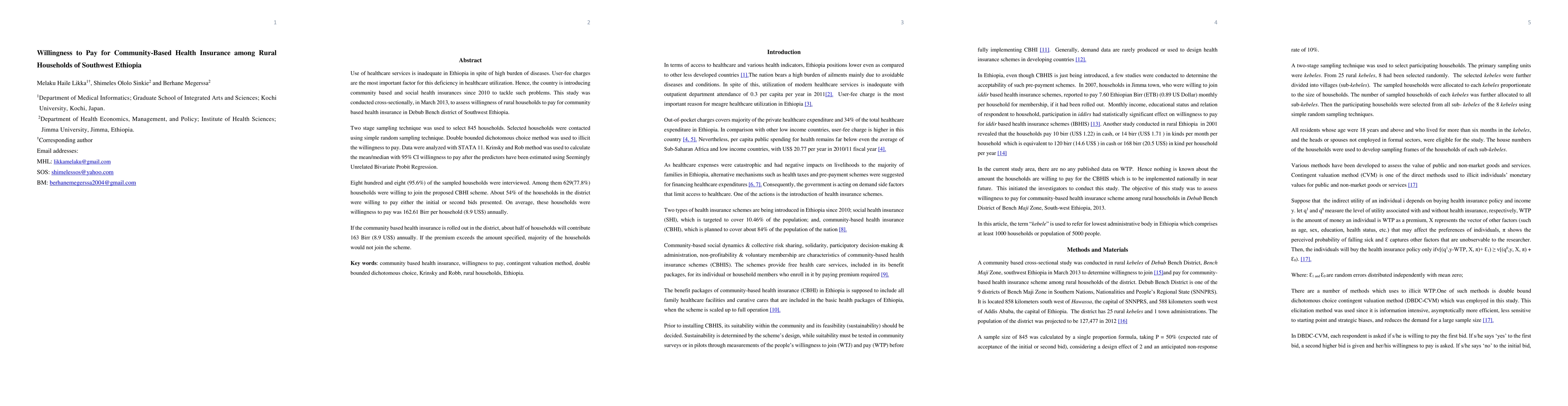 Use of healthcare services is inadequate in Ethiopia in spite of the high burden of diseases. User-fee charges are the most important factor for this deficiency in healthcare utilization. Hence, the country is introducing community based and social health insurances since 2010 to tackle such problems. This study was conducted cross-sectionally, in March 2013, to assess willingness of rural households to pay for community-based health insurance in Debub Bench district of Southwest Ethiopia. Two-stage sampling technique was used to select 845 households. Selected households were contacted using simple random sampling technique. Double bounded dichotomous choice method was used to illicit the willingness to pay. Data were analyzed with STATA 11. Krinsky and Rob method was used to calculate the mean/median with 95% CI willingness to pay after the predictors have been estimated using Seemingly Unrelated Bivariate Probit Regression. Eight hundred and eight (95.6%) of the sampled households were interviewed. Among them 629(77.8%) households were willing to join the proposed CBHI scheme. About 54% of the households in the district were willing to pay either the initial or second bids presented. On average, these households were willingness to pay was 162.61 Birr per household (8.9 US$) annually. If the community based health insurance is rolled out in the district, about half of households will contribute 163 Birr (8.9 US$) annually. If the premium exceeds the amount specified, majority of the households would not join the scheme. Key words: community based health insurance, willingness to pay, contingent valuation method, double bounded dichotomous choice, Krinsky and Robb, rural households, Ethiopia.