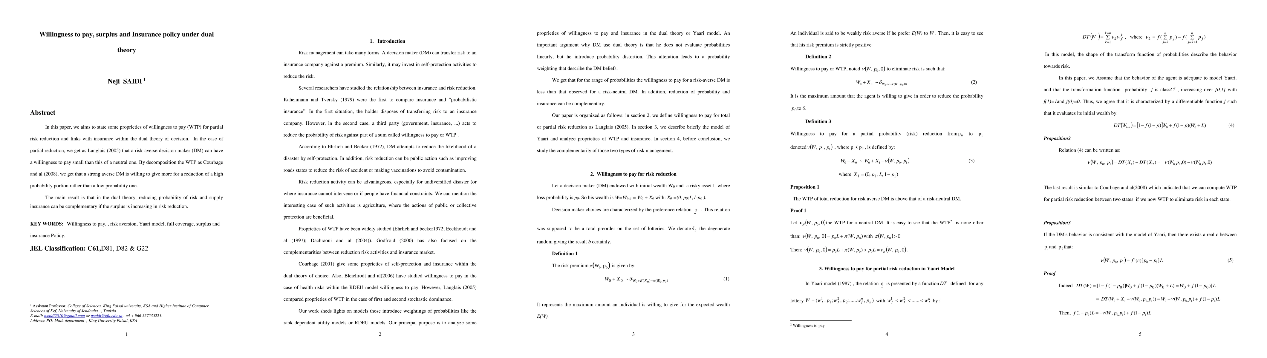 In this paper, we aims to state some proprieties of willingness to pay (WTP) for partial risk reduction and links with insurance within the dual theory of decision. In the case of partial reduction, we get as Langlais (2005) that a risk-averse decision maker (DM) can have a willingness to pay small than this of a neutral one. By decomposition the WTP as Courbage and al (2008), we get that a strong averse DM is willing to give more for a reduction of a high probability portion rather than a low probability one. The main result is that in the dual theory, reducing probability of risk and supply insurance can be complementary if the surplus is increasing in risk reduction.