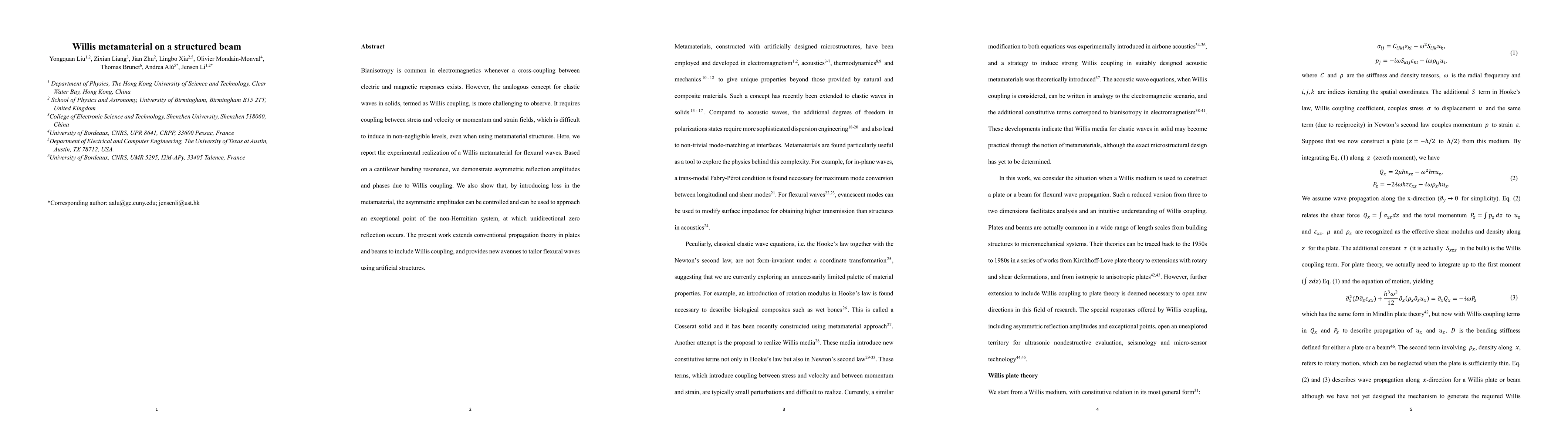Bianisotropy is common in electromagnetics whenever a cross-coupling between electric and magnetic responses exists. However, the analogous concept for elastic waves in solids, termed as Willis coupling, is more challenging to observe. It requires coupling between stress and velocity or momentum and strain fields, which is difficult to induce in non-negligible levels, even when using metamaterial structures. Here, we report the experimental realization of a Willis metamaterial for flexural waves. Based on a cantilever bending resonance, we demonstrate asymmetric reflection amplitudes and phases due to Willis coupling. We also show that, by introducing loss in the metamaterial, the asymmetric amplitudes can be controlled and can be used to approach an exceptional point of the non-Hermitian system, at which unidirectional zero reflection occurs. The present work extends conventional propagation theory in plates and beams to include Willis coupling, and provides new avenues to tailor flexural waves using artificial structures.