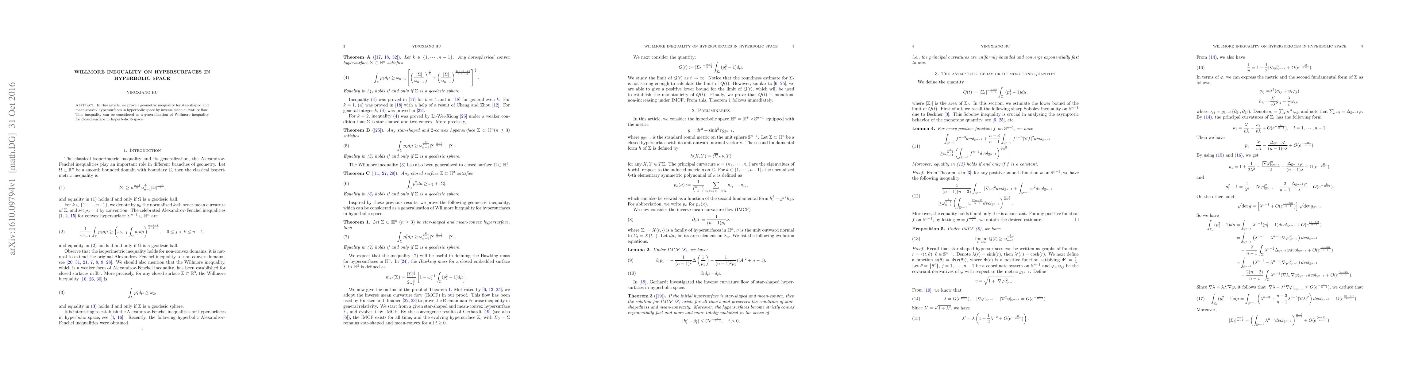 Summary: This paper proves a geometric inequality for star-shaped, mean-convex hypersurfaces in hyperbolic space via inverse mean curvature flow, generalizing the Willmore inequality for closed surfaces in hyperbolic 3-space.