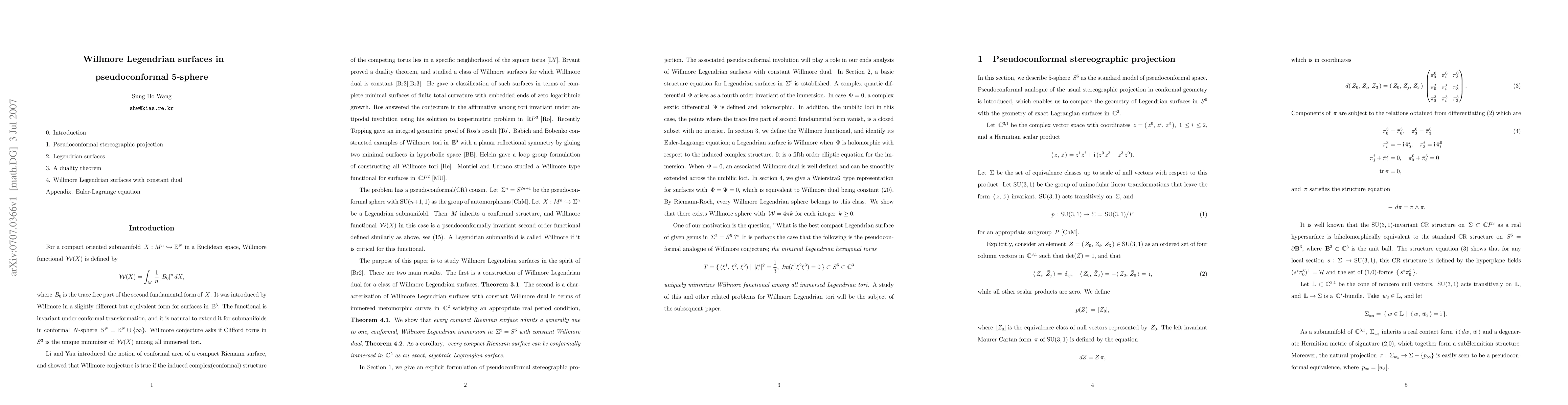 This paper introduces a pseudoconformally invariant Willmore functional for Legendrian surfaces in a pseudoconformal 5-sphere, studies its critical points, and proves that compact Riemann surfaces can be conformally immersed in $S^5$ as Willmore Legendrian surfaces with constant Willmore dual, leading to Lagrangian immersions in $\C^2$.