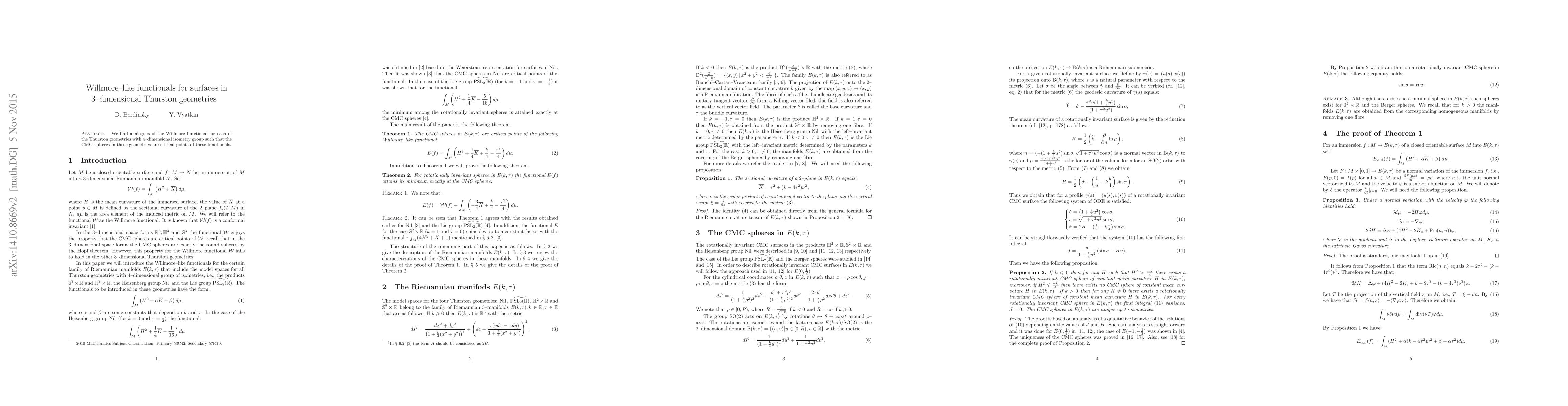 The paper introduces and analyzes Willmore-like functionals for Thurston geometries with 4-dimensional isometry groups, establishing CMC-spheres as critical points.