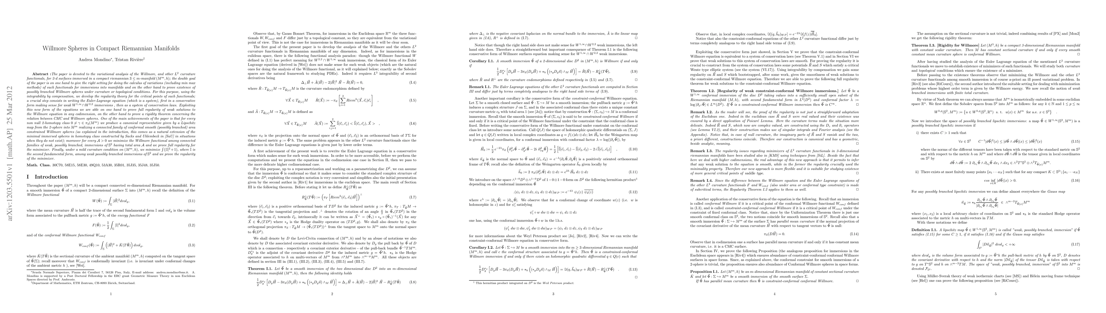 This paper explores variational analysis of Willmore and related L^2 curvature functionals for immersions of 2D surfaces into higher-dimensional compact Riemannian manifolds. It establishes existence and regularity results for branched Willmore spheres under various constraints and proves a rigidity theorem linking CMC and Willmore spheres.