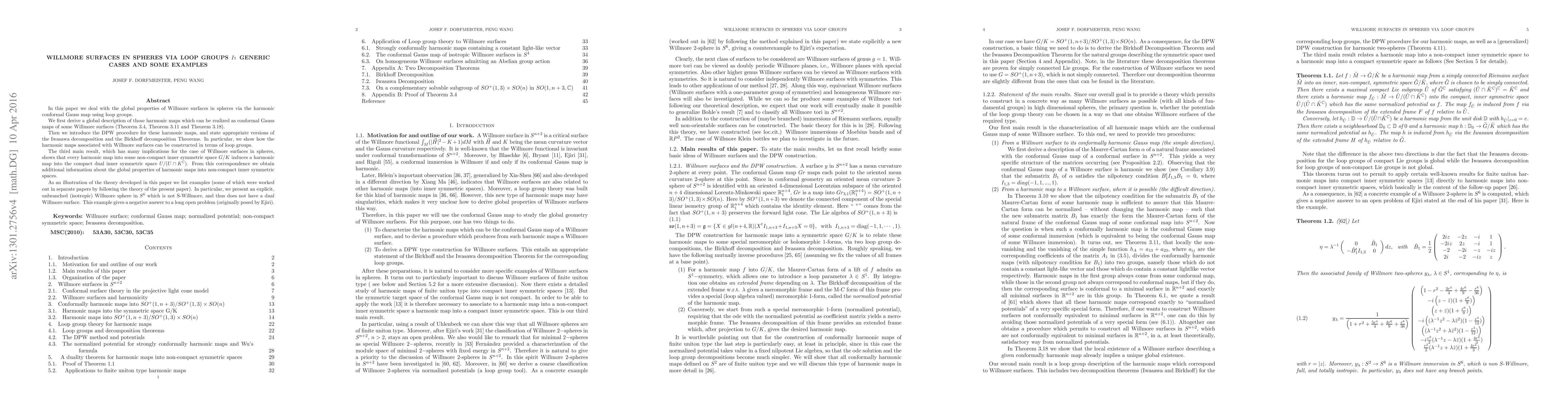 In this paper we deal with the global properties of Willmore surfaces in spheres via the harmonic conformal Gauss map using loop groups. We first derive a global description of those harmonic maps which can be realized as conformal Gauss maps of some Willmore surfaces (Theorem 3.4, Theorem 3.11 and Theorem 3.18). Then we introduce the DPW procedure for these harmonic maps, and state appropriate versions of the Iwasawa decomposition and the Birkhoff decomposition Theorems. In particular, we show how the harmonic maps associated with Willmore surfaces can be constructed in terms of loop groups. The third main result, which has many implications for the case of Willmore surfaces in spheres, shows that every harmonic map into some non-compact inner symmetric space $G/K$ induces a harmonic map into the compact dual inner symmetric space $U/{(U \cap K^\mathbb{C})}$. From this correspondence we obtain additional information about the global properties of harmonic maps into non-compact inner symmetric spaces. As an illustration of the theory developed in this paper we list examples (some of which were worked out in separate papers by following the theory of the present paper). In particular, we present an explicit, unbranched (isotropic) Willmore sphere in $S^6$ which is not S-Willmore, and thus does not have a dual Willmore surface. This example gives a negative answer to a long open problem (originally posed by Ejiri).