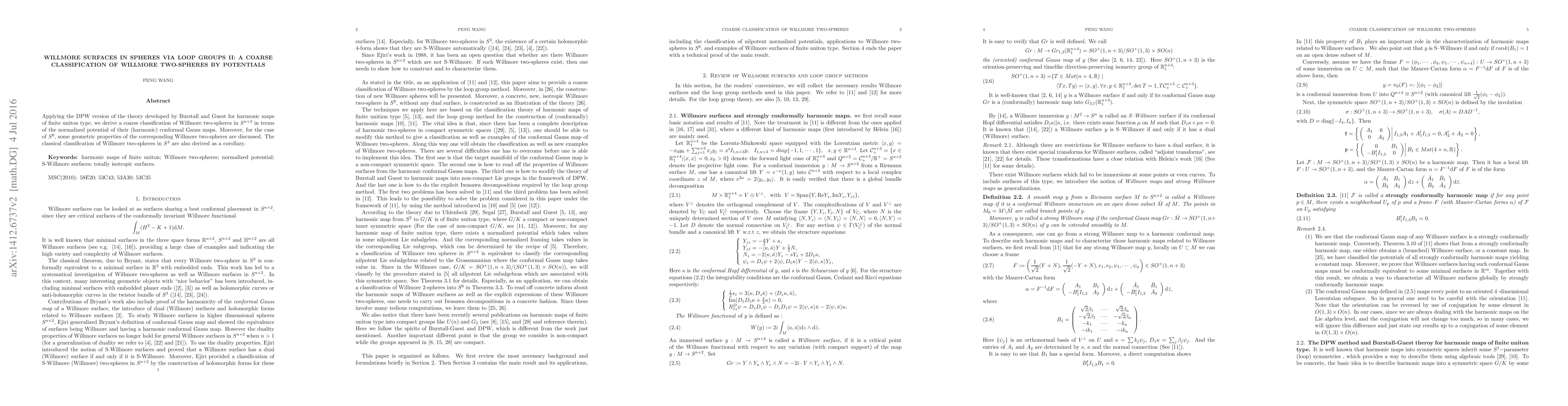 Applying the DPW version of the theory developed by Burstall and Guest for harmonic maps of finite uniton type, we derive a coarse classification of Willmore two-spheres in $S^{n+2}$ in terms of the normalized potential of their (harmonic) conformal Gauss maps. Moreover, for the case of $S^6$, some geometric properties of the corresponding Willmore two-spheres are discussed. The classical classification of Willmore two-spheres in $S^4$ are also derived as a corollary.