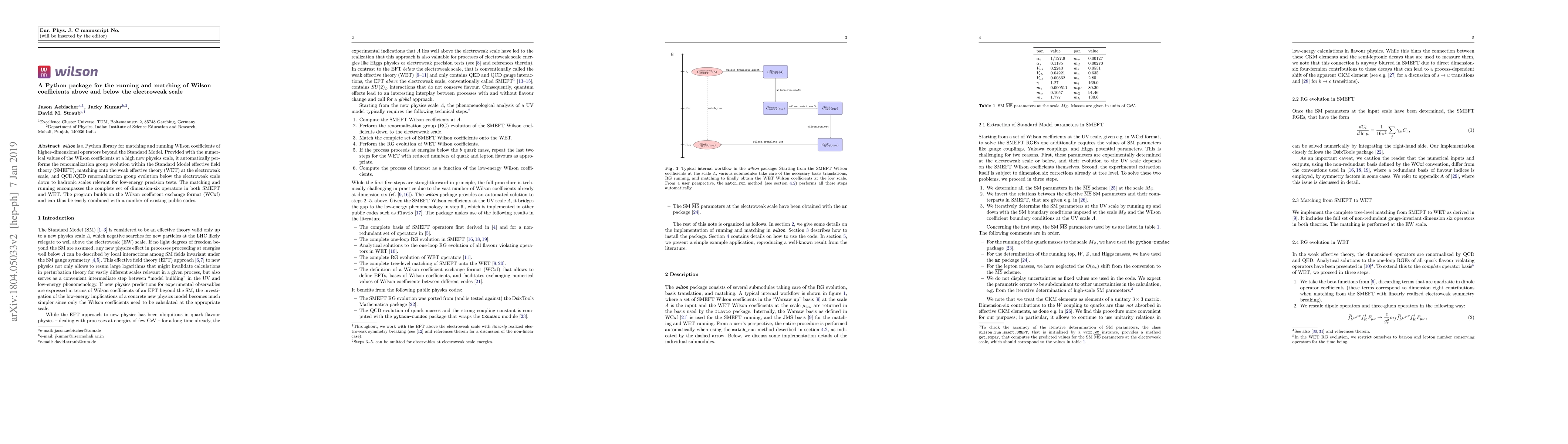 Summary: Wilson is a Python package for automating the matching and running of Wilson coefficients for higher-dimensional operators in the Standard Model Effective Field Theory, facilitating the evolution from high new physics scales to low-energy precision tests through the electroweak and QCD/QED scales. It supports the complete set of dimension-six operators and integrates seamlessly with existing codes via the WCxf format.