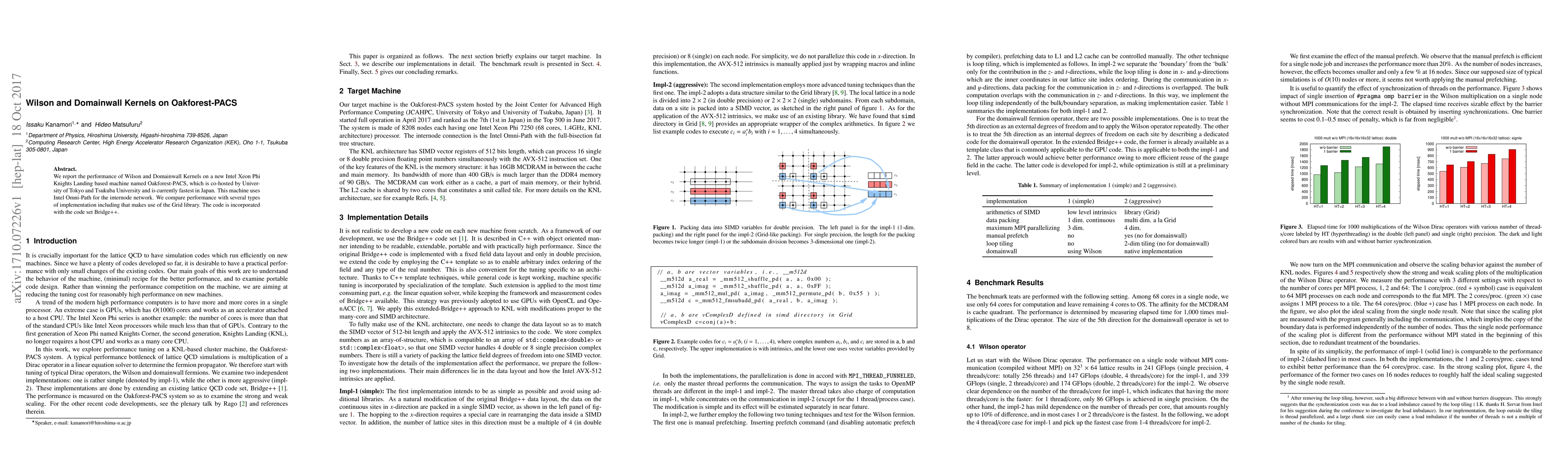 This paper evaluates the performance of Wilson and Domainwall kernels on the Oakforest-PACS supercomputer, the fastest in Japan, which utilizes Intel Xeon Phi Knights Landing processors and the Omni-Path internode network. The study compares various implementations including those using the Grid library and the Bridge++ code set.