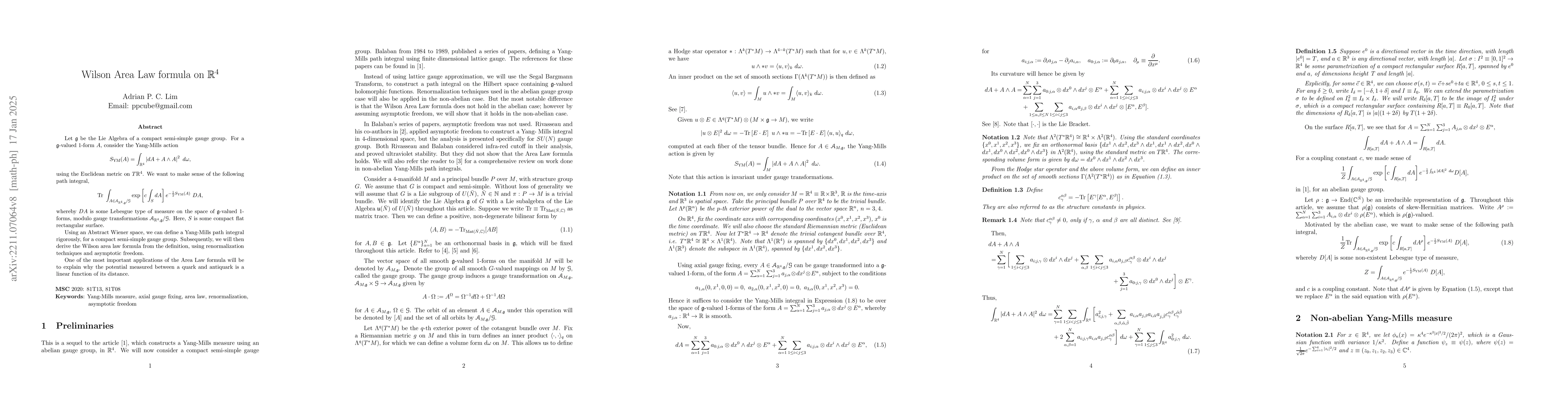 Let $\mathfrak{g}$ be the Lie Algebra of a compact semi-simple gauge group. For a $\mathfrak{g}$-valued 1-form $A$, consider the Yang-Mills action \begin{equation} S_{{\rm YM}}(A) = \int_{\mathbb{R}^4} \left|dA + A \wedge A \right|^2\ d\omega \nonumber \end{equation} using the standard metric on $T\mathbb{R}^4$. We want to make sense of the following path integral, \begin{equation} {\rm Tr}\ \int_{A \in \mathcal{A}_{\mathbb{R}^4, \mathfrak{g}} /\mathcal{G}} \exp \left[ c\int_{S} dA\right] e^{-\frac{1}{2}S_{{\rm YM}}(A)}\ DA, \nonumber \end{equation} whereby $DA$ is some Lebesgue type of measure on the space of $\mathfrak{g}$-valued 1-forms, modulo gauge transformations $\mathcal{A}_{\mathbb{R}^4, \mathfrak{g}} /\mathcal{G}$. Here, $S$ is some compact flat rectangular surface. Using an Abstract Wiener space, we can define a Yang-Mills path integral rigorously, for a compact semi-simple gauge group. Subsequently, we will then derive the Wilson area law formula from the definition, using renormalization techniques and asymptotic freedom. One of the most important applications of the Area Law formula will be to explain why the potential measured between a quark and antiquark is a linear potential.