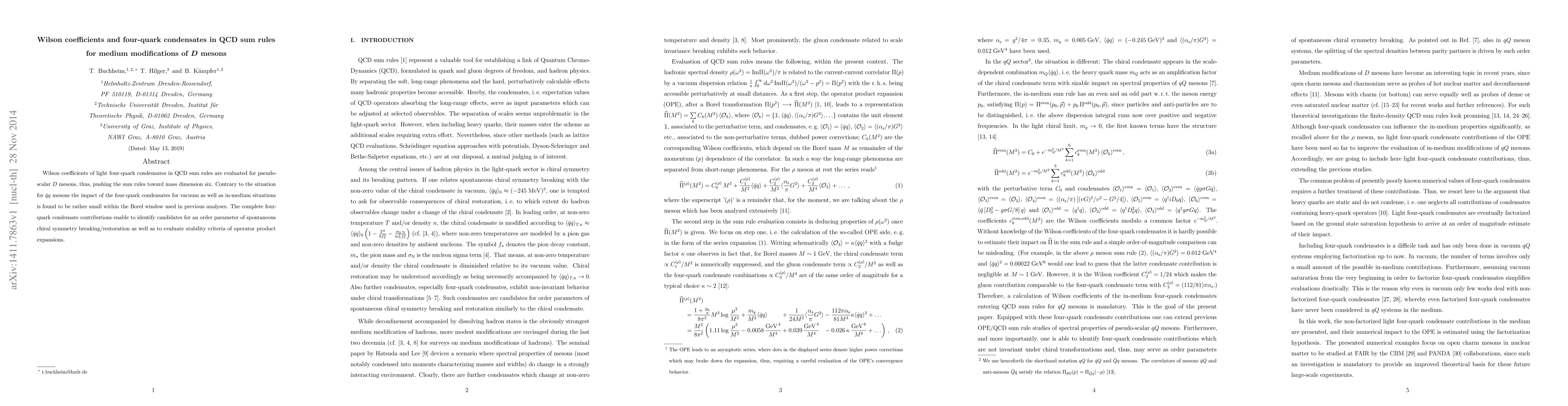 Wilson coefficients of light four-quark condensates in QCD sum rules are evaluated for pseudo-scalar $D$ mesons, thus, pushing the sum rules toward mass dimension six. Contrary to the situation for $\bar{q}q$ mesons the impact of the four-quark condensates for vacuum as well as in-medium situations is found to be rather small within the Borel window used in previous analyses. The complete four-quark condensate contributions enable to identify candidates for an order parameter of spontaneous chiral symmetry breaking/restoration as well as to evaluate stability criteria of operator product expansions.