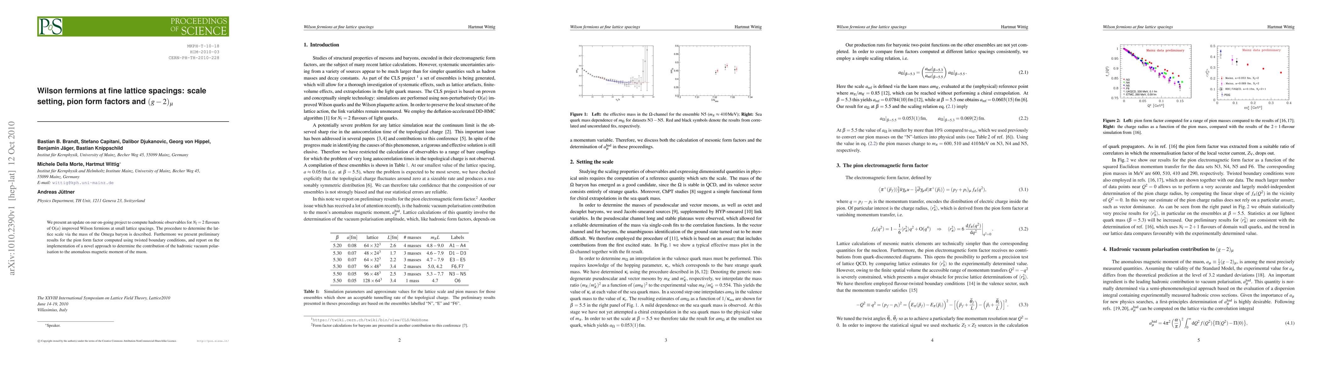 Researchers computed hadronic observables for Nf=2 flavors of Wilson fermions at small lattice spacings using the Omega baryon mass to determine the lattice scale and preliminary results were obtained for pion form factors and a novel approach to calculate the muon's anomalous magnetic moment.