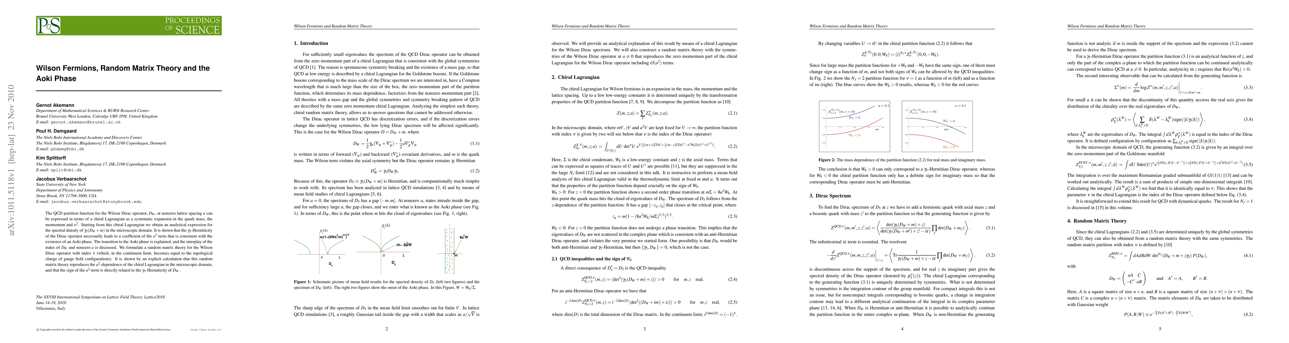 The QCD partition function for the Wilson Dirac operator, $D_W$, at nonzero lattice spacing $a$ can be expressed in terms of a chiral Lagrangian as a systematic expansion in the quark mass, the momentum and $a^2$. Starting from this chiral Lagrangian we obtain an analytical expression for the spectral density of $\gamma_5 (D_W+m)$ in the microscopic domain. It is shown that the $\gamma_5$-Hermiticity of the Dirac operator necessarily leads to a coefficient of the $a^2$ term that is consistent with the existence of an Aoki phase. The transition to the Aoki phase is explained, and the interplay of the index of $D_W$ and nonzero $a$ is discussed. We formulate a random matrix theory for the Wilson Dirac operator with index $\nu$ (which, in the continuum limit, becomes equal to the topological charge of gauge field configurations). It is shown by an explicit calculation that this random matrix theory reproduces the $a^2$-dependence of the chiral Lagrangian in the microscopic domain, and that the sign of the $a^2$-term is directly related to the $\gamma_5$-Hermiticity of $D_W$.