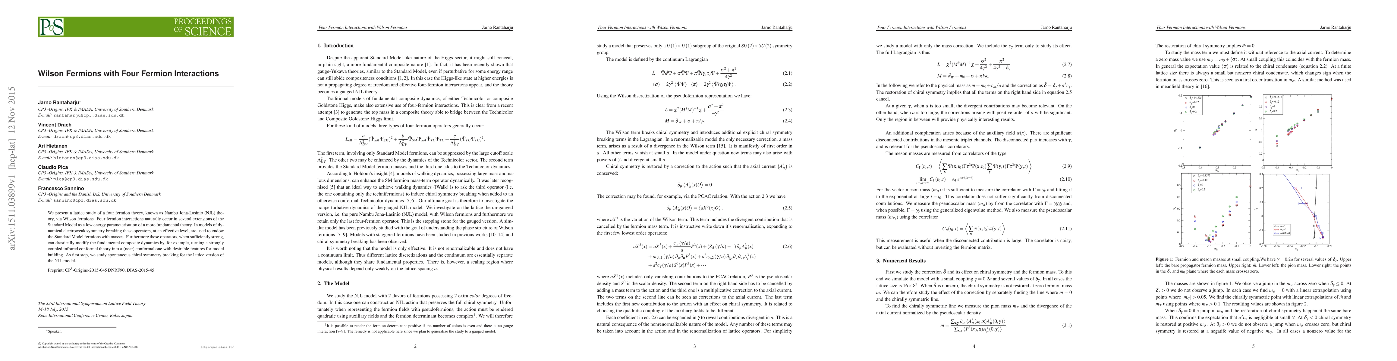 We present a lattice study of a four fermion theory, known as Nambu Jona-Lasinio (NJL) theory, via Wilson fermions. Four fermion interactions naturally occur in several extensions of the Standard Model as a low energy parameterisation of a more fundamental theory. In models of dynamical electroweak symmetry breaking these operators, at an effective level, are used to endow the Standard Model fermions with masses. Furthermore these operators, when sufficiently strong, can drastically modify the fundamental composite dynamics by, for example, turning a strongly coupled infrared conformal theory into a (near) conformal one with desirable features for model building. As first step, we study spontaneous chiral symmetry breaking for the lattice version of the NJL model.