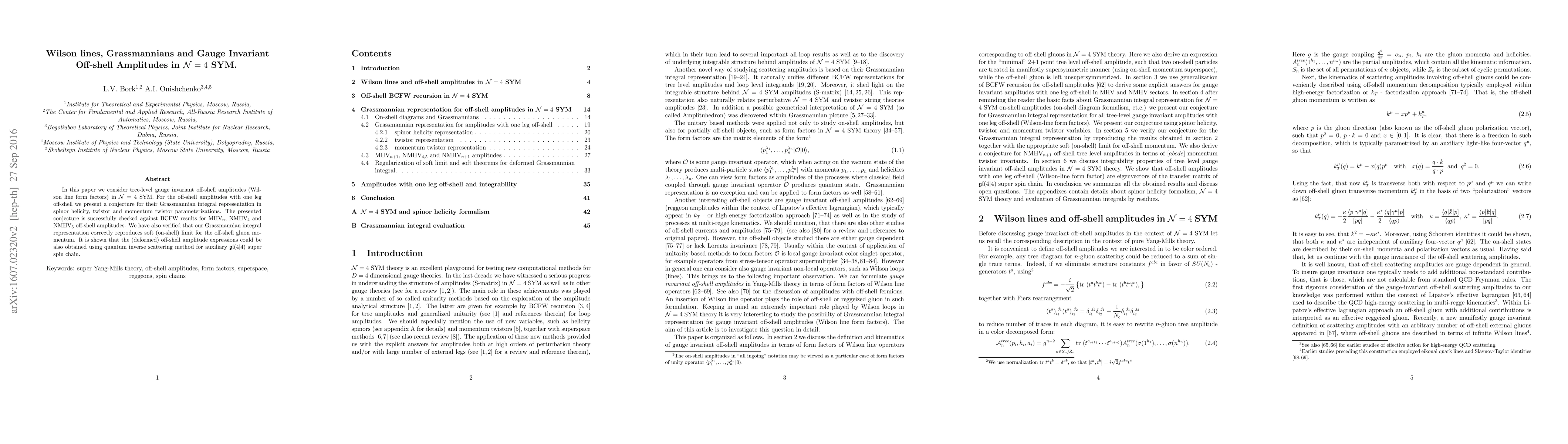 In this paper we consider tree-level gauge invariant off-shell amplitudes (Wilson line form factors) in $\mathcal{N}=4$ SYM. For the off-shell amplitudes with one leg off-shell we present a conjecture for their Grassmannian integral representation in spinor helicity, twistor and momentum twistor parameterizations. The presented conjecture is successfully checked against BCFW results for MHV$_n$, NMHV$_4$ and NMHV$_5$ off-shell amplitudes. We have also verified that our Grassmannian integral representation correctly reproduces soft (on-shell) limit for the off-shell gluon momentum. It is shown that the (deformed) off-shell amplitude expressions could be also obtained using quantum inverse scattering method for auxiliary $gl(4|4)$ super spin chain.