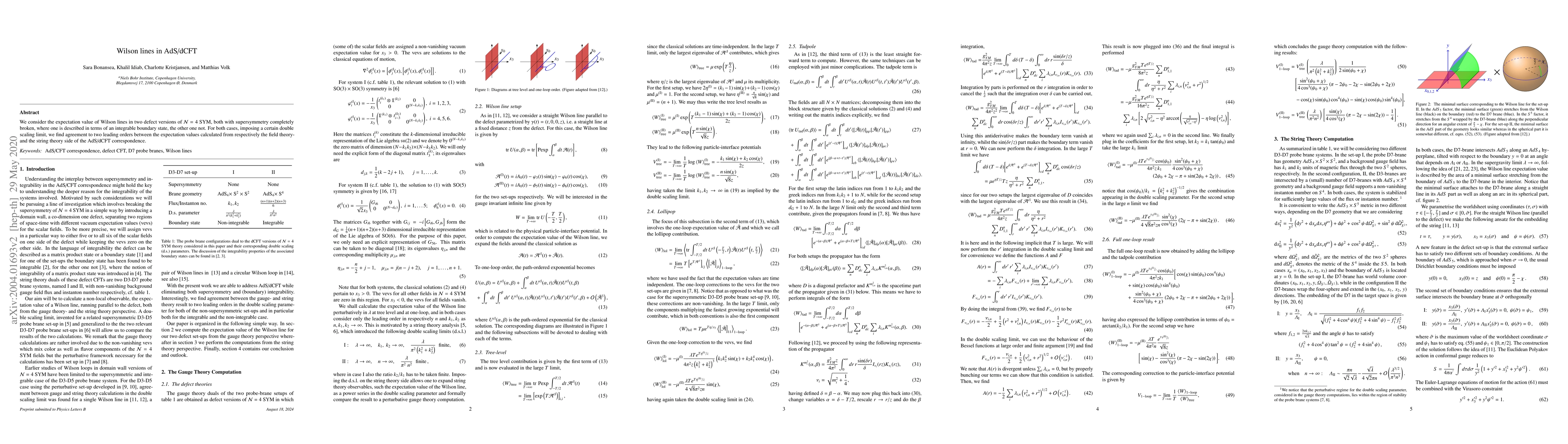 The paper investigates the expectation values of Wilson lines in two versions of N=4 SYM with broken supersymmetry, comparing results from field theory and string theory within the AdS/dCFT correspondence, and finds agreement up to the second leading order in a double scaling limit.