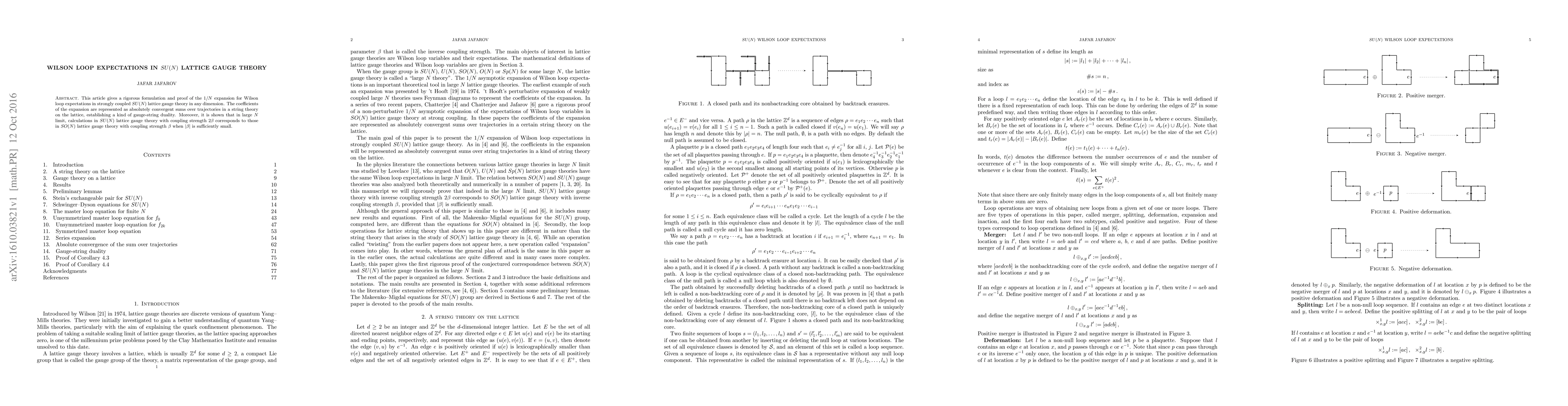 This paper rigorously formulates and proves a $1/N$ expansion for Wilson loop expectations in strongly coupled $SU(N)$ lattice gauge theory, revealing a gauge-string duality through convergent sums over lattice trajectories. It also demonstrates a correspondence between $SU(N)$ and $SO(N)$ lattice gauge theories in the large $N$ limit.