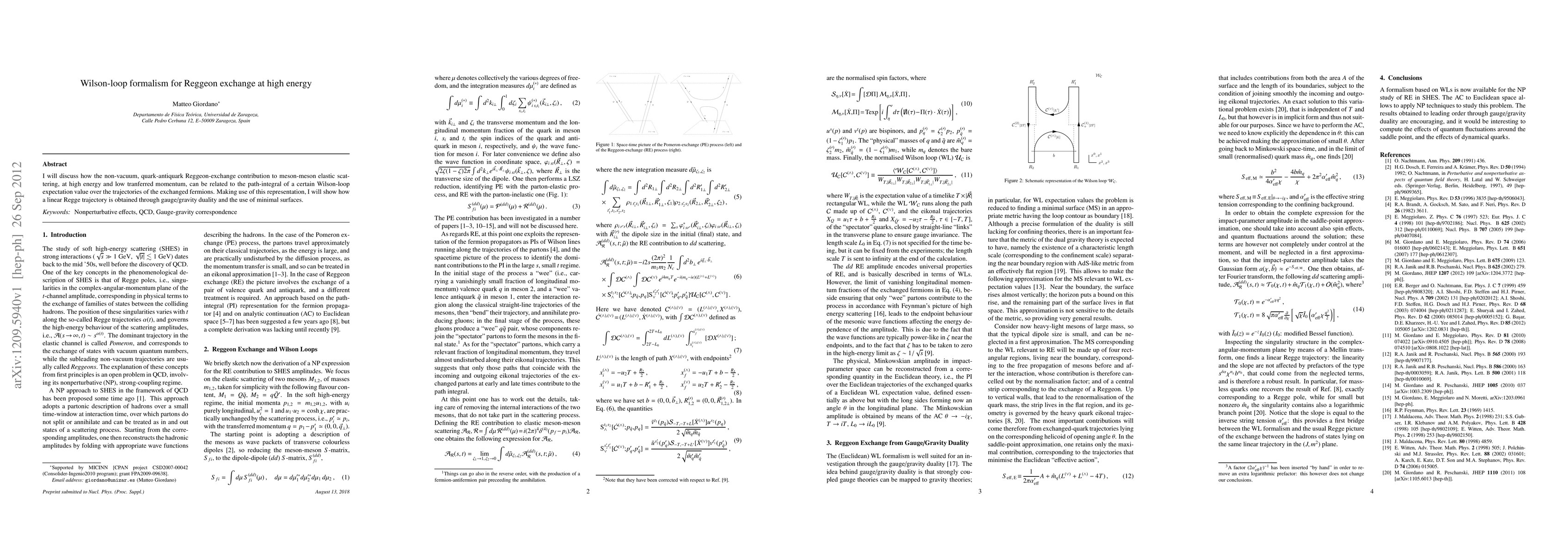 I will discuss how the non-vacuum, quark-antiquark Reggeon-exchange contribution to meson-meson elastic scattering, at high energy and low tranferred momentum, can be related to the path-integral of a certain Wilson-loop expectation value over the trajectories of the exchanged fermions. Making use of this representation, I will show how a linear Regge trajectory is obtained through gauge/gravity duality and the use of minimal surfaces.