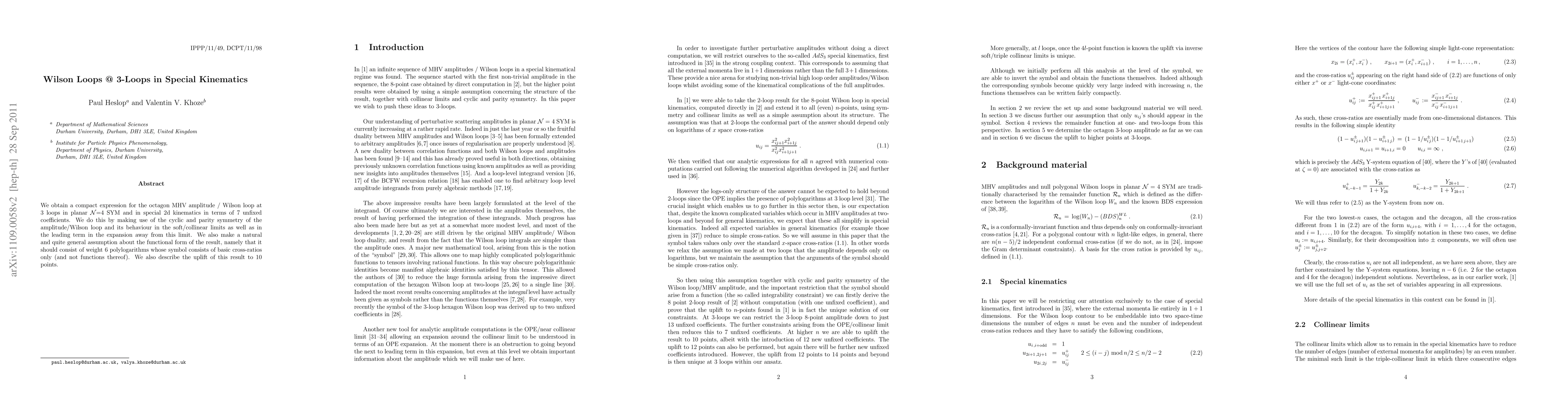 We obtain a compact expression for the octagon MHV amplitude / Wilson loop at 3 loops in planar N=4 SYM and in special 2d kinematics in terms of 7 unfixed coefficients. We do this by making use of the cyclic and parity symmetry of the amplitude/Wilson loop and its behaviour in the soft/collinear limits as well as in the leading term in the expansion away from this limit. We also make a natural and quite general assumption about the functional form of the result, namely that it should consist of weight 6 polylogarithms whose symbol consists of basic cross-ratios only (and not functions thereof). We also describe the uplift of this result to 10 points.