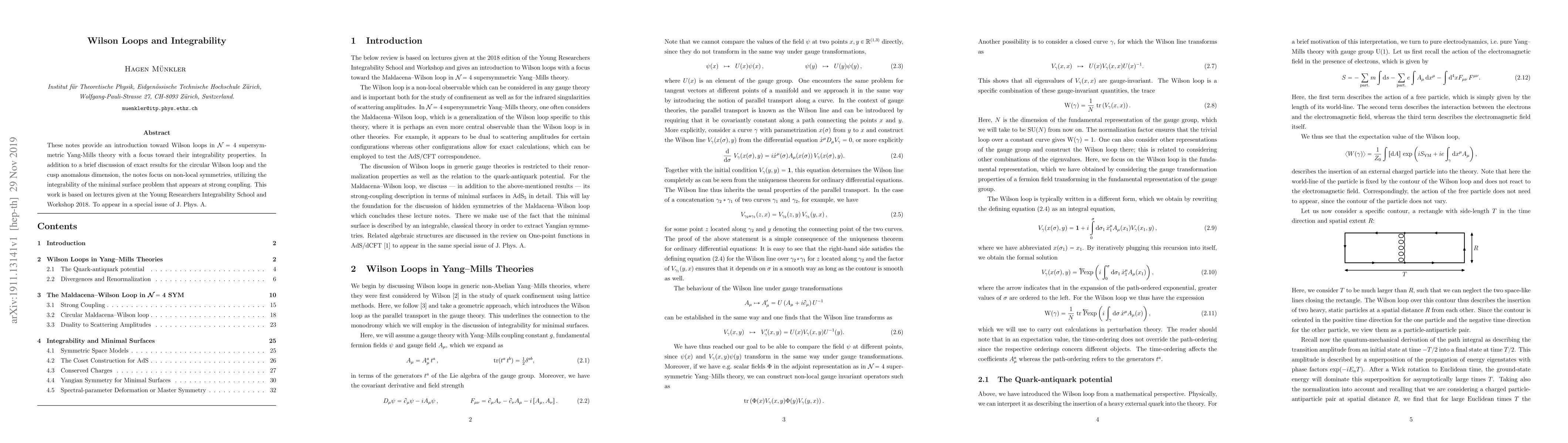 These notes introduce Wilson loops in N=4 supersymmetric Yang-Mills theory, emphasizing their integrability and exact results for the circular Wilson loop. They explore non-local symmetries through the integrability of the minimal surface problem at strong coupling, based on lectures from the 2018 Young Researchers Integrability School and Workshop.
