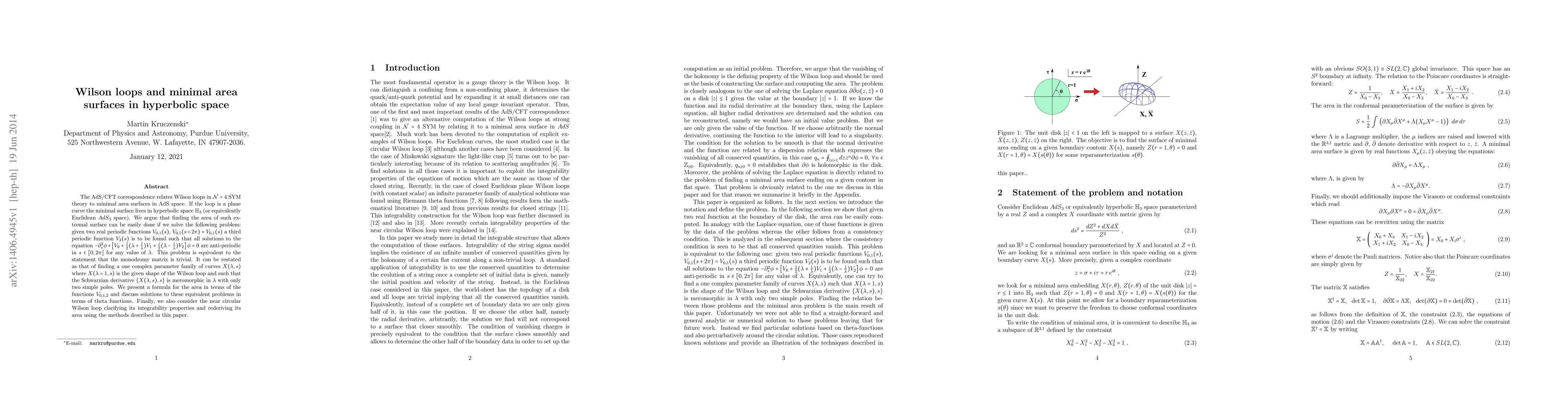 This paper explores the relationship between Wilson loops in $N$=4 SYM theory and minimal area surfaces in hyperbolic space, proposing a method to determine the area of extremal surfaces by solving a differential equation involving periodic functions. It presents a formula for the area and discusses solutions using theta functions and integrability properties of near circular Wilson loops.