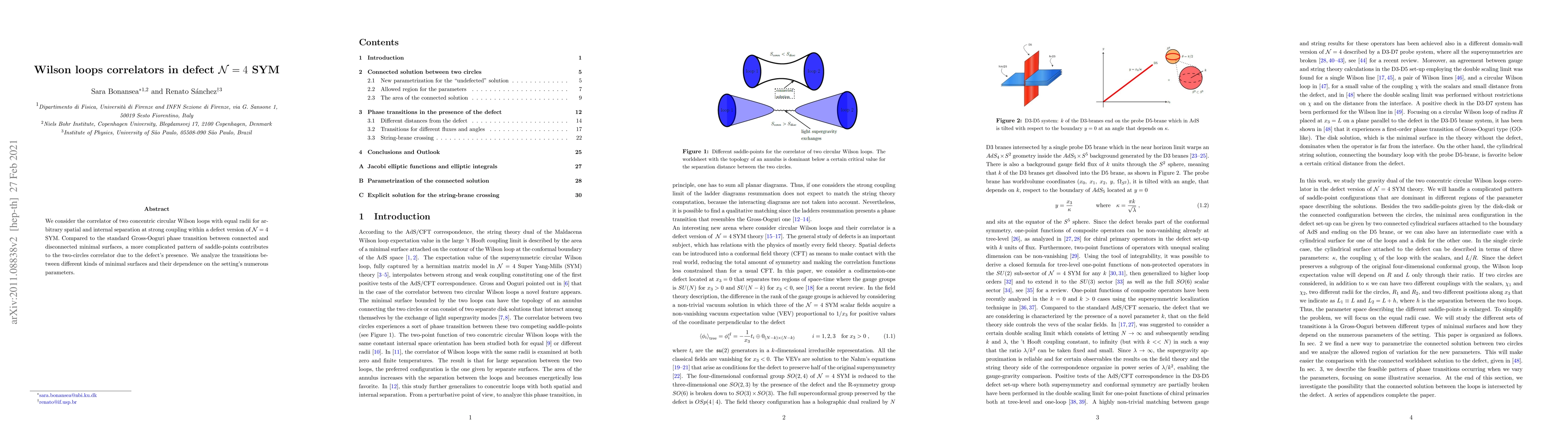 Summary: This research investigates the correlator of two concentric circular Wilson loops in a defect version of $\mathcal{N}=4$ SYM at strong coupling, revealing a complex pattern of minimal surface contributions compared to the standard phase transition, and analyzes the transitions between different minimal surfaces dependent on various parameters.