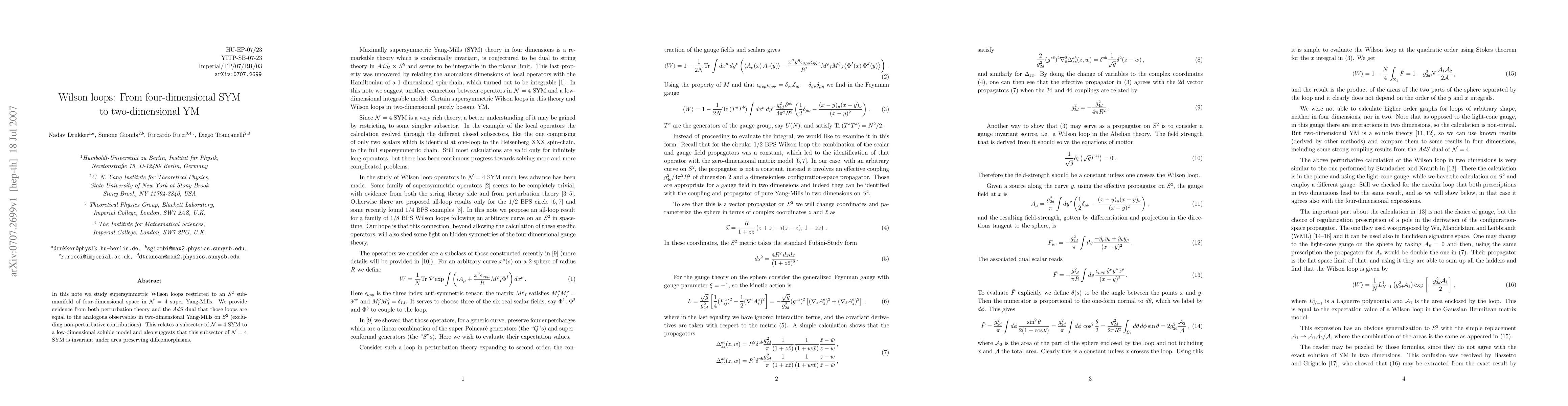 In this note we study supersymmetric Wilson loops restricted to an S^2 submanifold of four-dimensional space in N=4 super Yang-Mills. We provide evidence from both perturbation theory and the AdS dual that those loops are equal to the analogous observables in two-dimensional Yang-Mills on S^2 (excluding non-perturbative contributions). This relates a subsector of N=4 SYM to a low-dimensional soluble model and also suggests that this subsector of N =4 SYM is invariant under area preserving diffeomorphisms.