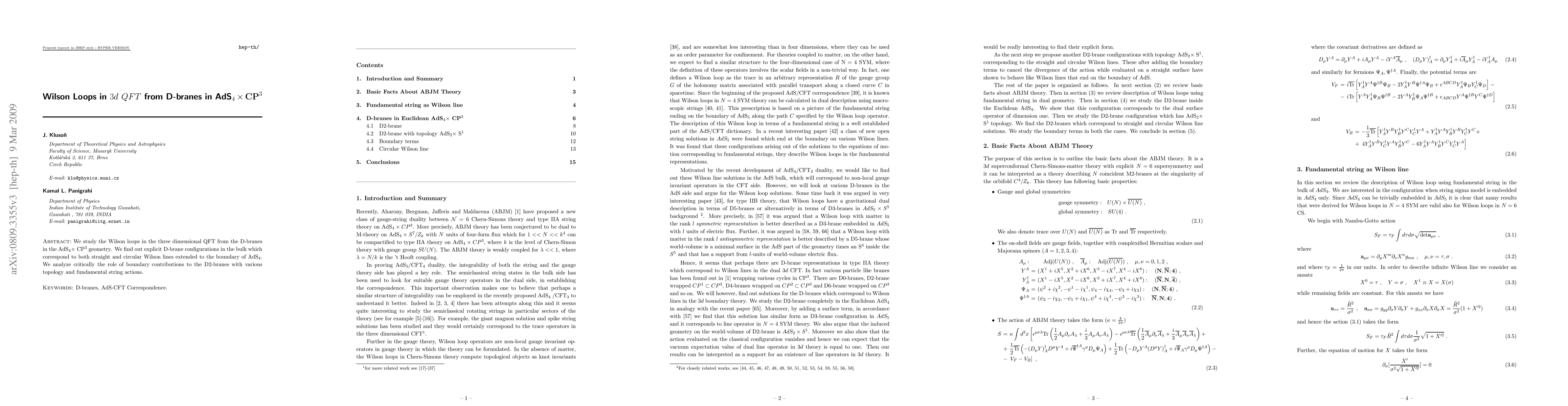 This paper explores the relationship between Wilson loops in a 3D quantum field theory and D-branes in the AdS(4) x CP**3 geometry, identifying specific D-brane configurations that correspond to straight and circular Wilson lines. It also examines the impact of boundary contributions on D2-brane topology and fundamental string actions.