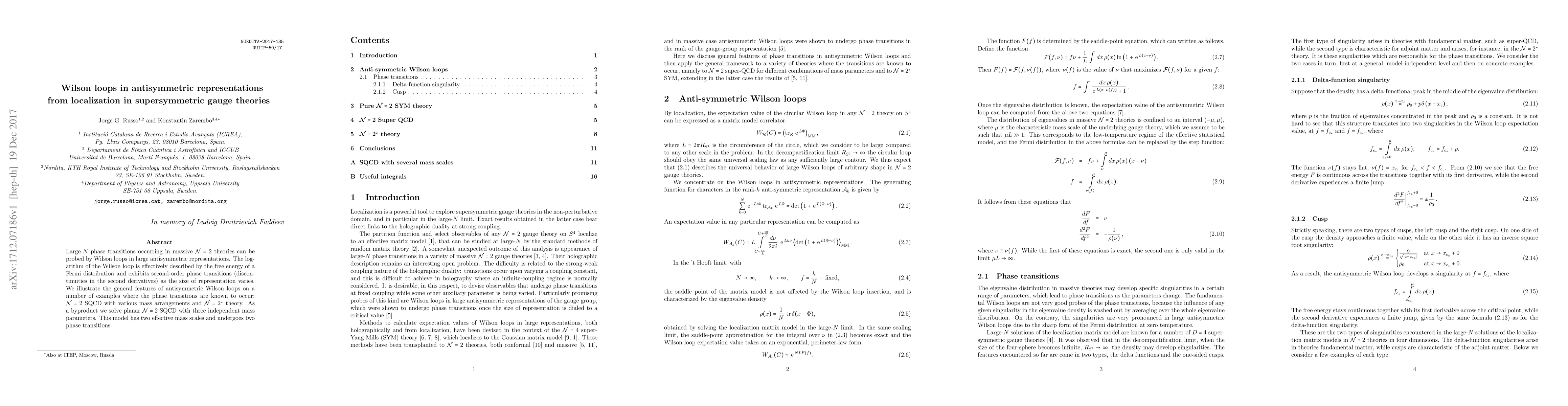 Large-N phase transitions occurring in massive N=2 theories can be probed by Wilson loops in large antisymmetric representations. The logarithm of the Wilson loop is effectively described by the free energy of a Fermi distribution and exhibits second-order phase transitions (discontinuities in the second derivatives) as the size of representation varies. We illustrate the general features of antisymmetric Wilson loops on a number of examples where the phase transitions are known to occur: N=2 SQCD with various mass arrangements and N=2* theory. As a byproduct we solve planar N=2 SQCD with three independent mass parameters. This model has two effective mass scales and undergoes two phase transitions.