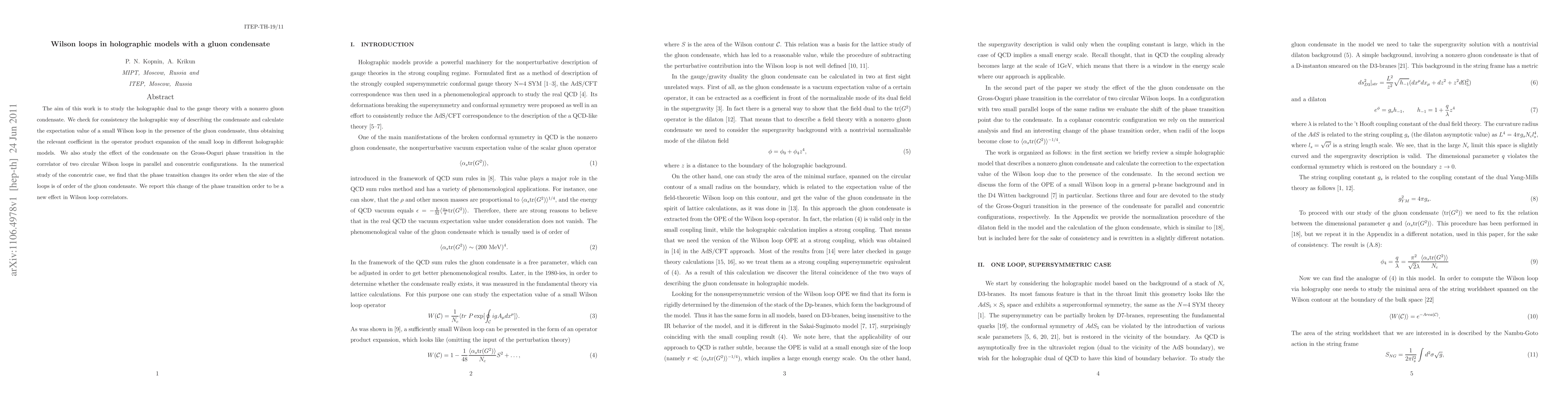 This paper investigates the holographic dual of gauge theory with a nonzero gluon condensate, calculating the expectation value of small Wilson loops and analyzing the impact of the condensate on the Gross-Ooguri phase transition in correlators of circular Wilson loops. It reveals a new effect where the phase transition order changes when loop sizes are comparable to the gluon condensate.