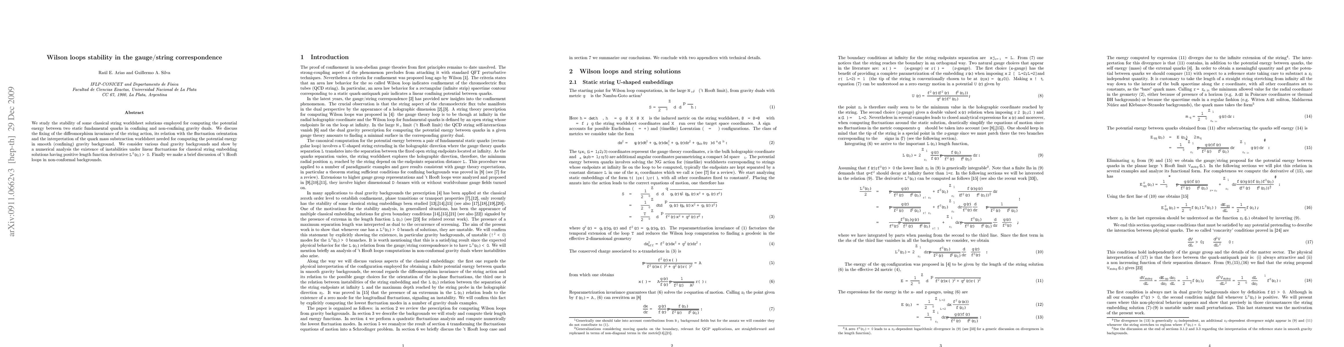 We study the stability of some classical string worldsheet solutions employed for computing the potential energy between two static fundamental quarks in confining and non-confining gravity duals. We discuss the fixing of the diffeomorphism invariance of the string action, its relation with the fluctuation orientation and the interpretation of the quark mass substraction worldsheet needed for computing the potential energy in smooth (confining) gravity background. We consider various dual gravity backgrounds and show by a numerical analysis the existence of instabilities under linear fluctuations for classical string embedding solutions having positive length function derivative $L'(r_0)>0$. Finally we make a brief discussion of 't Hooft loops in non-conformal backgrounds.