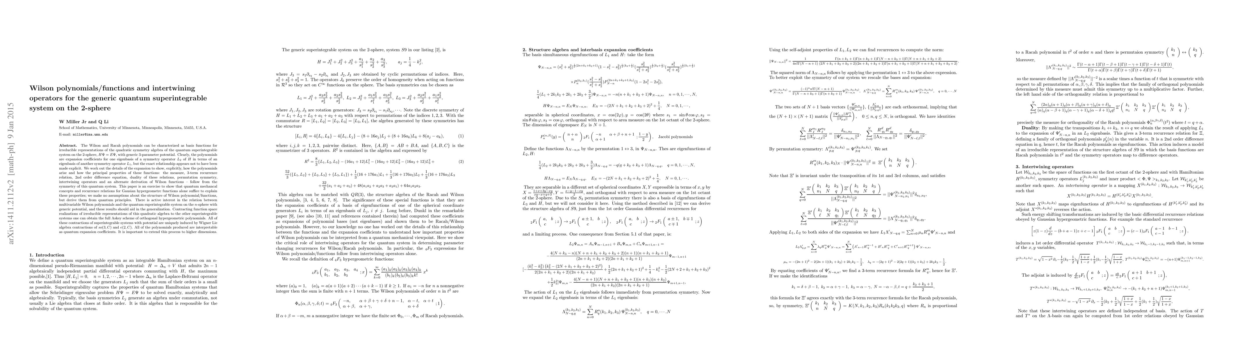 This paper explores the relationship between Wilson and Racah polynomials and the quantum superintegrable system on the 2-sphere, detailing how these polynomials arise from the symmetry of the system. It elucidates the intertwining operators and properties of Wilson functions, and discusses the potential for extending these findings to higher dimensions.