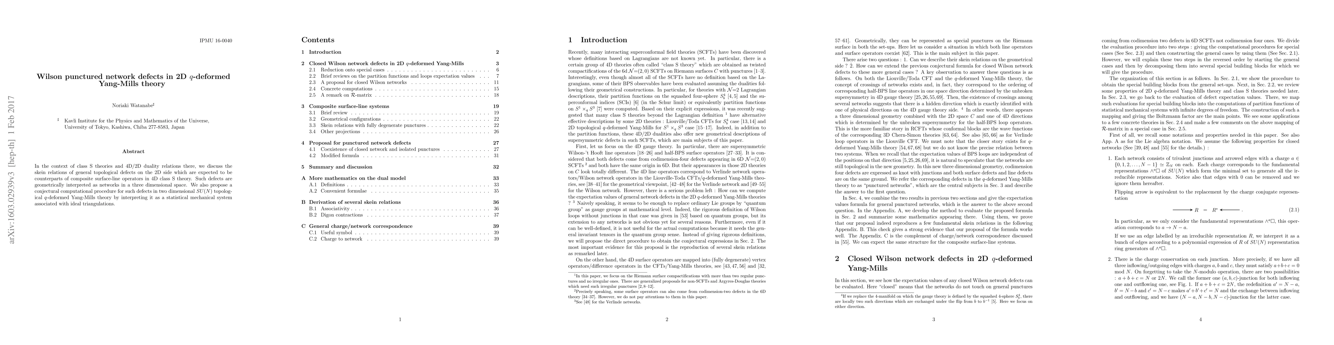The paper discusses topological defects in 2D q-deformed Yang-Mills theory, proposing they are counterparts of composite operators in 4D class S theories, and suggests a statistical mechanical approach for computing these defects via ideal triangulations.