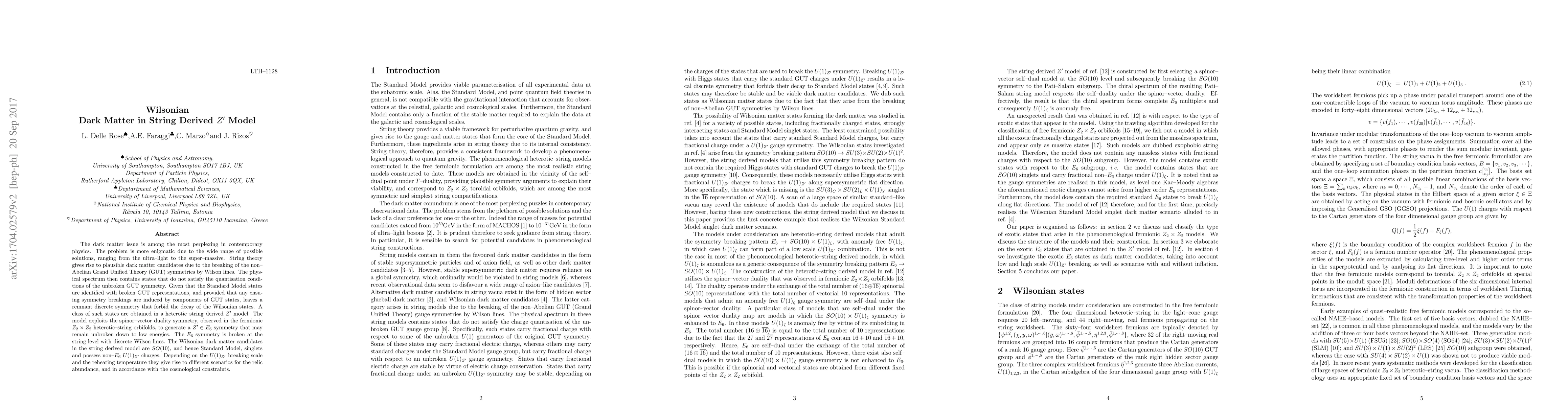 The dark matter issue is among the most perplexing in contemporary physics. The problem is more enigmatic due to the wide range of possible solutions, ranging from the ultra-light to the super-massive. String theory gives rise to plausible dark matter candidates due to the breaking of the non--Abelian Grand Unified Theory (GUT) symmetries by Wilson lines. The physical spectrum then contains states that do not satisfy the quantisation conditions of the unbroken GUT symmetry. Given that the Standard Model states are identified with broken GUT representations, and provided that any ensuing symmetry breaking is induced by components of GUT states, leaves a remnant discrete symmetry that forbid the decay of the Wilsonian states. A class of such states are obtained in a heterotic-string derived $Z^\prime$ model. The model exploits the spinor-vector duality symmetry, observed in the fermionic $Z_2\times Z_2$ heterotic-string orbifolds, to generate a $Z^\prime\in E_6$ symmetry that may remain unbroken down to low energies. The $E_6$ symmetry is broken at the string level with discrete Wilson lines. The Wilsonian dark matter candidates in the string derived model are $SO(10)$, and hence Standard Model, singlets and possess non-$E_6$ $U(1)_{Z^\prime}$ charges. Depending on the $U(1)_{Z^\prime}$ breaking scale and the reheating temperature they give rise to different scenarios for the relic abundance, and in accordance with the cosmological constraints.