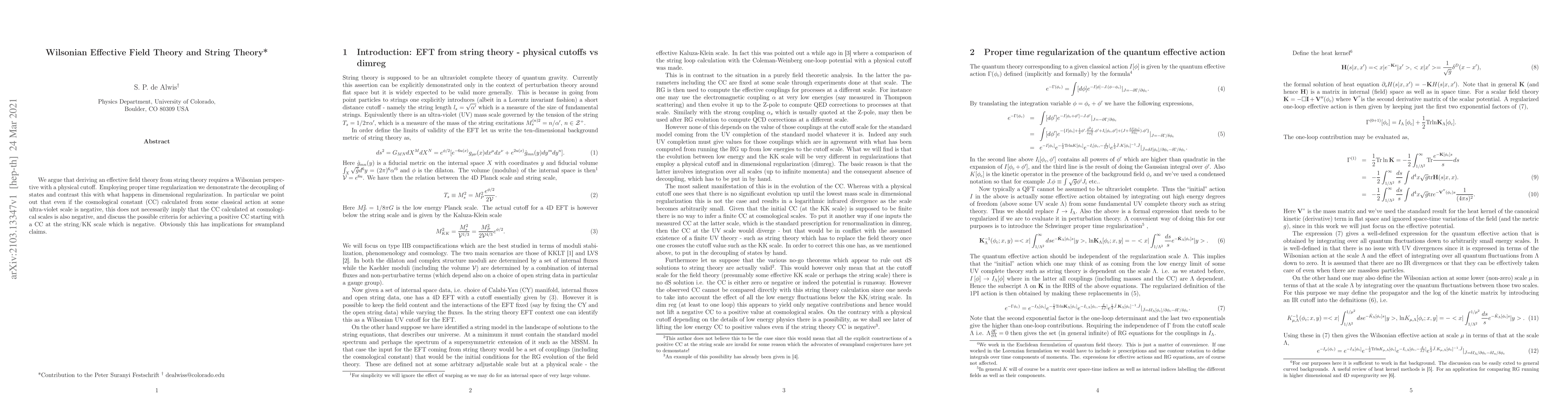 This paper argues for a Wilsonian perspective in deriving effective field theory from string theory, using proper time regularization to show state decoupling. It highlights that a negative cosmological constant at the string scale does not guarantee a negative value at cosmological scales, with implications for understanding the swampland criteria.