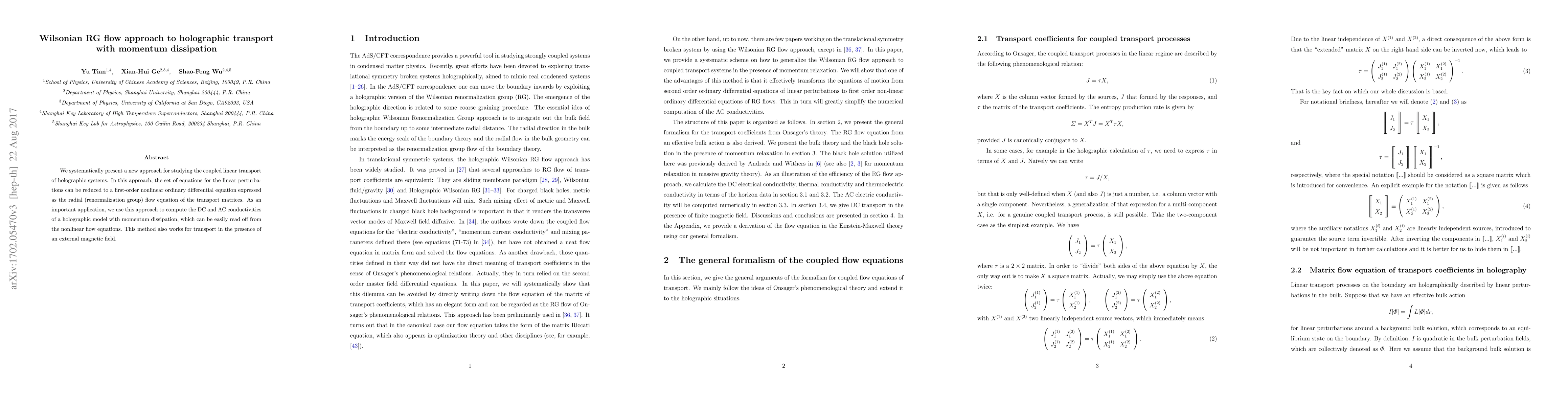 This paper introduces a Wilsonian renormalization group approach to study linear transport in holographic systems, reducing complex transport equations to a first-order nonlinear ODE. It applies this method to compute DC and AC conductivities in a holographic model featuring momentum dissipation, extending its utility to systems with external magnetic fields.