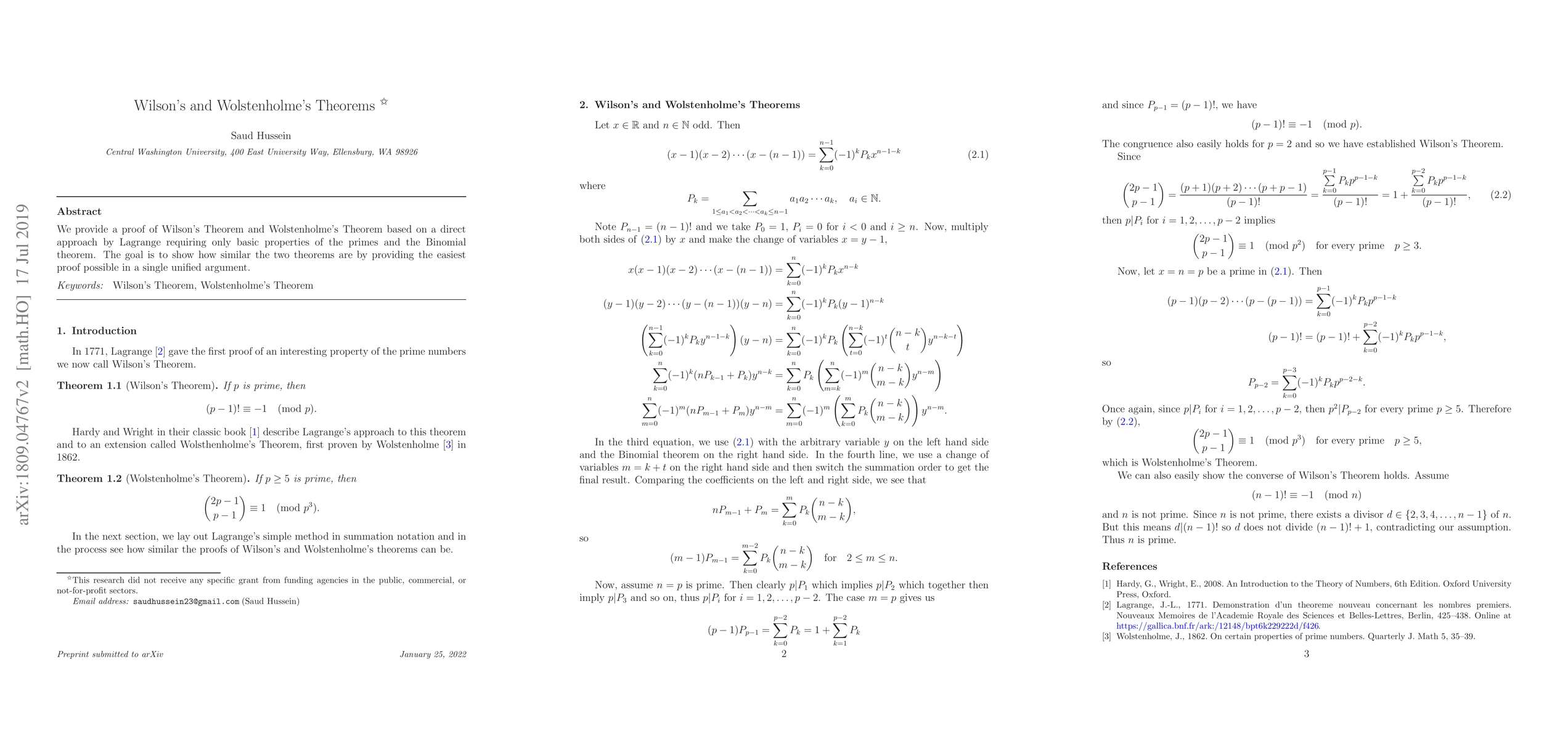 The research presents a proof of Wilson's and Wolstenholme's Theorems using Lagrange's direct approach, requiring only fundamental properties of primes and the Binomial theorem.
