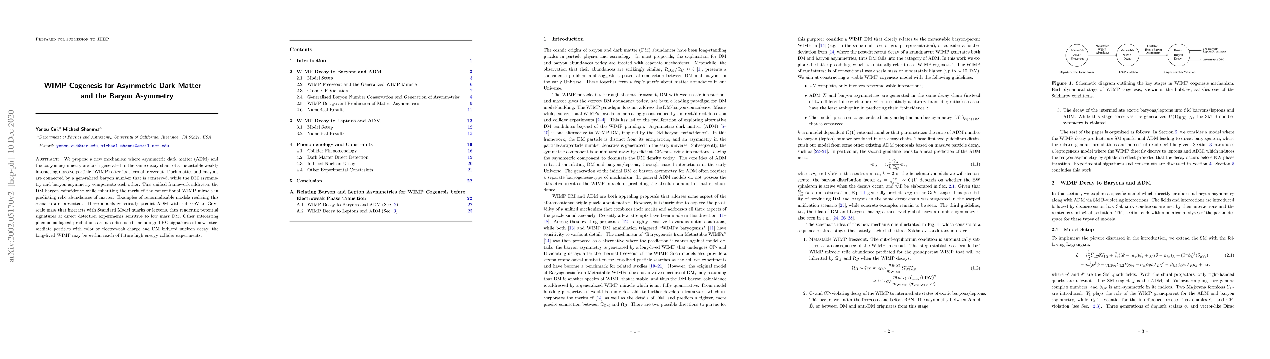 This paper proposes a novel mechanism where asymmetric dark matter and the baryon asymmetry are generated from the decay of a metastable WIMP, addressing the DM-baryon coincidence and predicting sub-GeV to GeV-scale dark matter with potential signatures at direct detection experiments. The framework also predicts new particles detectable at the LHC and suggests the long-lived WIMP could be observed in future high-energy colliders.