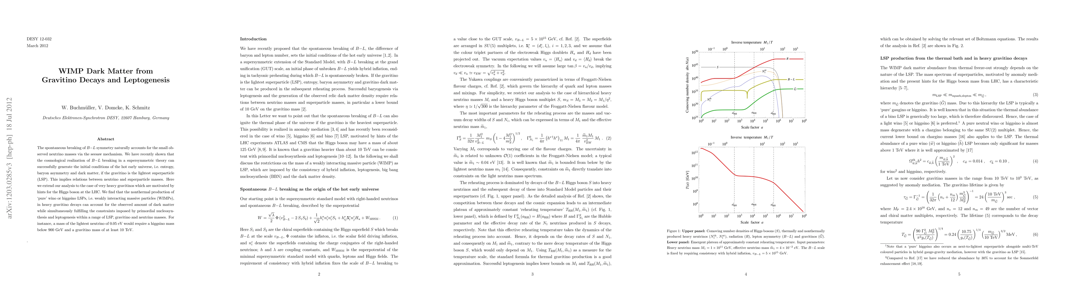 This paper explores the potential of gravitino decays to produce WIMPs as dark matter, while also generating the baryon asymmetry and satisfying leptogenesis constraints. It finds that heavy gravitinos, motivated by LHC Higgs data, can decay to produce higgsino or wino LSPs that meet dark matter requirements and cosmological constraints.
