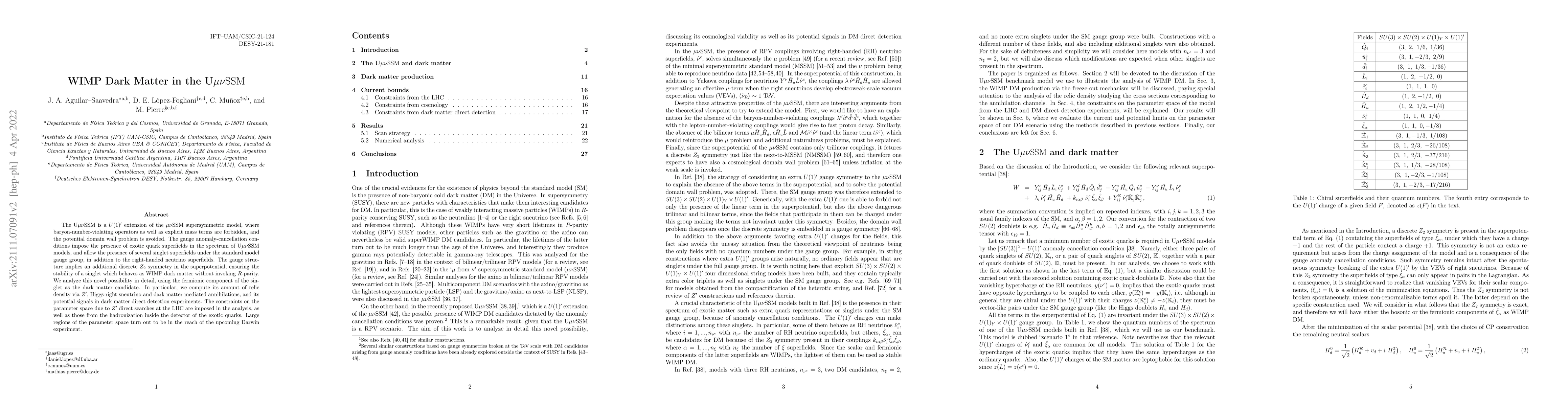 This paper explores the WIMP dark matter potential in the U$\mu\nu$SSM, a supersymmetric model that avoids domain wall problems and baryon-number-violating operators. It identifies a singlet as the WIMP dark matter candidate, analyzing its relic density and potential signals in direct detection experiments, while considering constraints from LHC and Darwin experiments.
