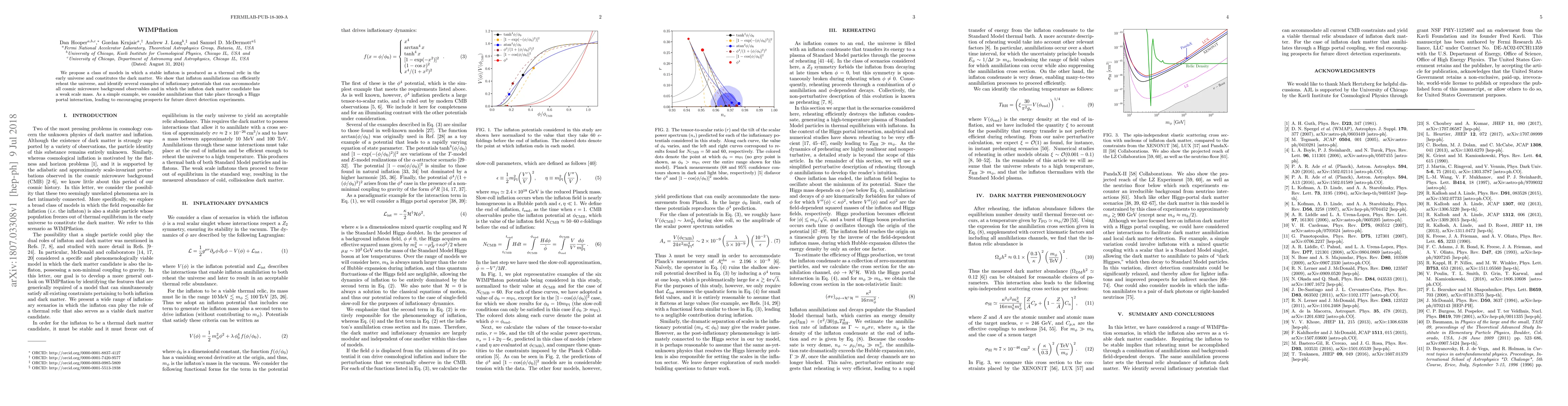 The paper 'WIMPflation' proposes models where the stable inflaton, also serving as dark matter, is a thermal relic from the early universe. It demonstrates that inflaton annihilations can reheat the universe, and presents inflationary potential examples compatible with cosmic microwave background data and a weak scale mass inflaton dark matter candidate. A Higgs portal interaction example is provided, suggesting promising outcomes for future direct detection experiments.