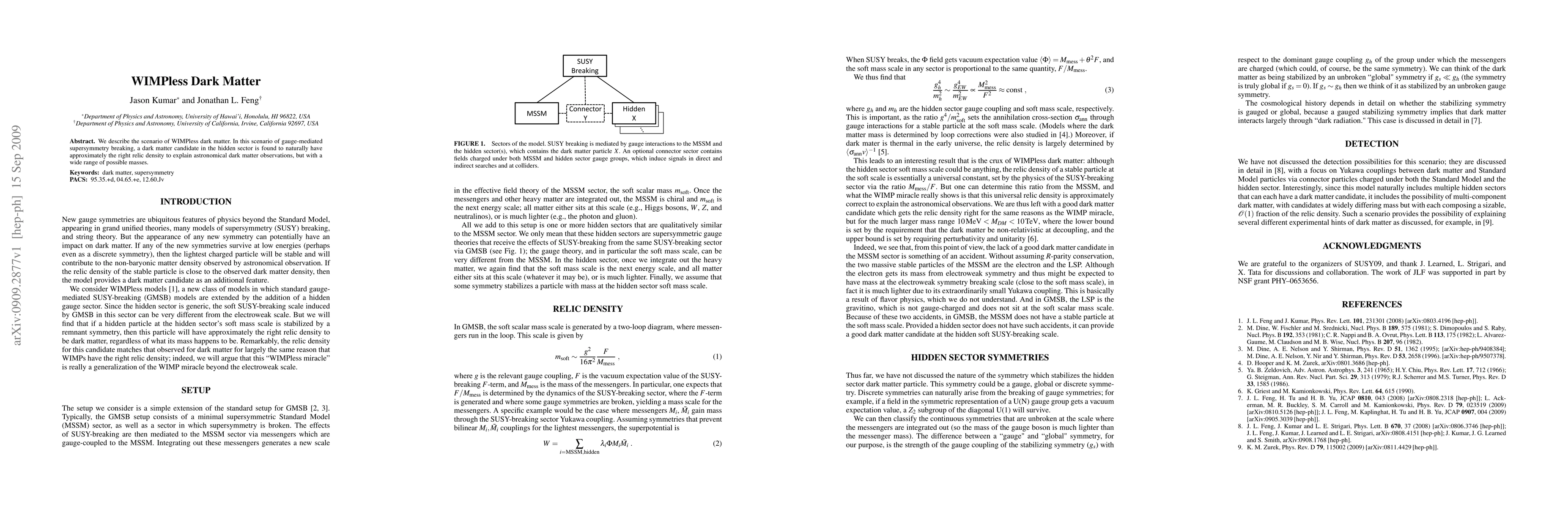 We describe the scenario of WIMPless dark matter. In this scenario of gauge-mediated supersymmetry breaking, a dark matter candidate in the hidden sector is found to naturally have approximately the right relic density to explain astronomical dark matter observations, but with a wide range of possible masses.