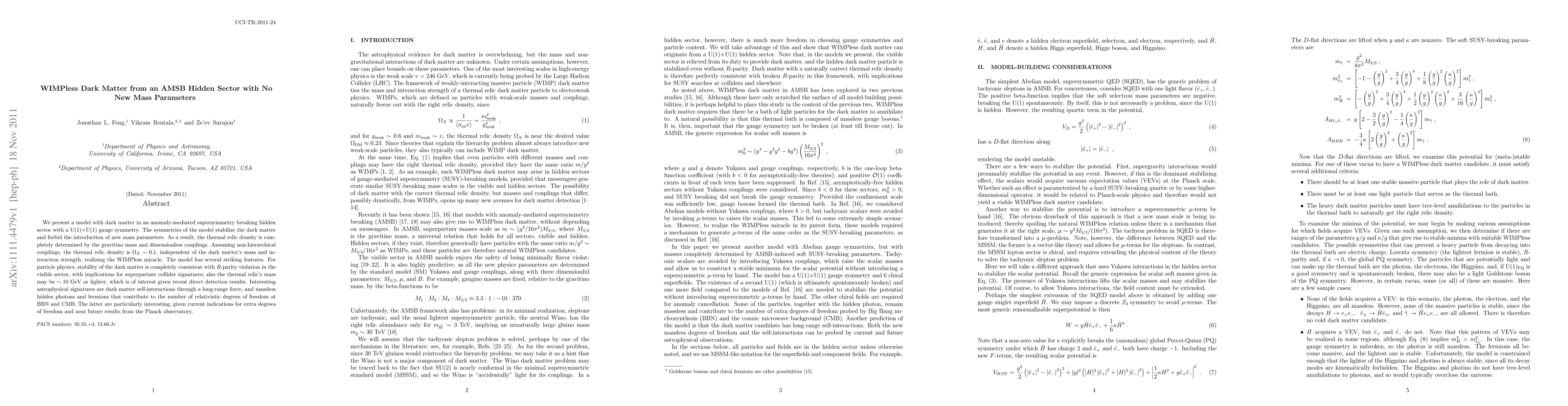 We present a model with dark matter in an anomaly-mediated supersymmetry breaking hidden sector with a U(1)xU(1) gauge symmetry. The symmetries of the model stabilize the dark matter and forbid the introduction of new mass parameters. As a result, the thermal relic density is completely determined by the gravitino mass and dimensionless couplings. Assuming non-hierarchical couplings, the thermal relic density is ~ 0.1, independent of the dark matter's mass and interaction strength, realizing the WIMPless miracle. The model has several striking features. For particle physics, stability of the dark matter is completely consistent with R-parity violation in the visible sector, with implications for superpartner collider signatures; also the thermal relic's mass may be ~ 10 GeV or lighter, which is of interest given recent direct detection results. Interesting astrophysical signatures are dark matter self-interactions through a long-range force, and massless hidden photons and fermions that contribute to the number of relativistic degrees of freedom at BBN and CMB. The latter are particularly interesting, given current indications for extra degrees of freedom and near future results from the Planck observatory.