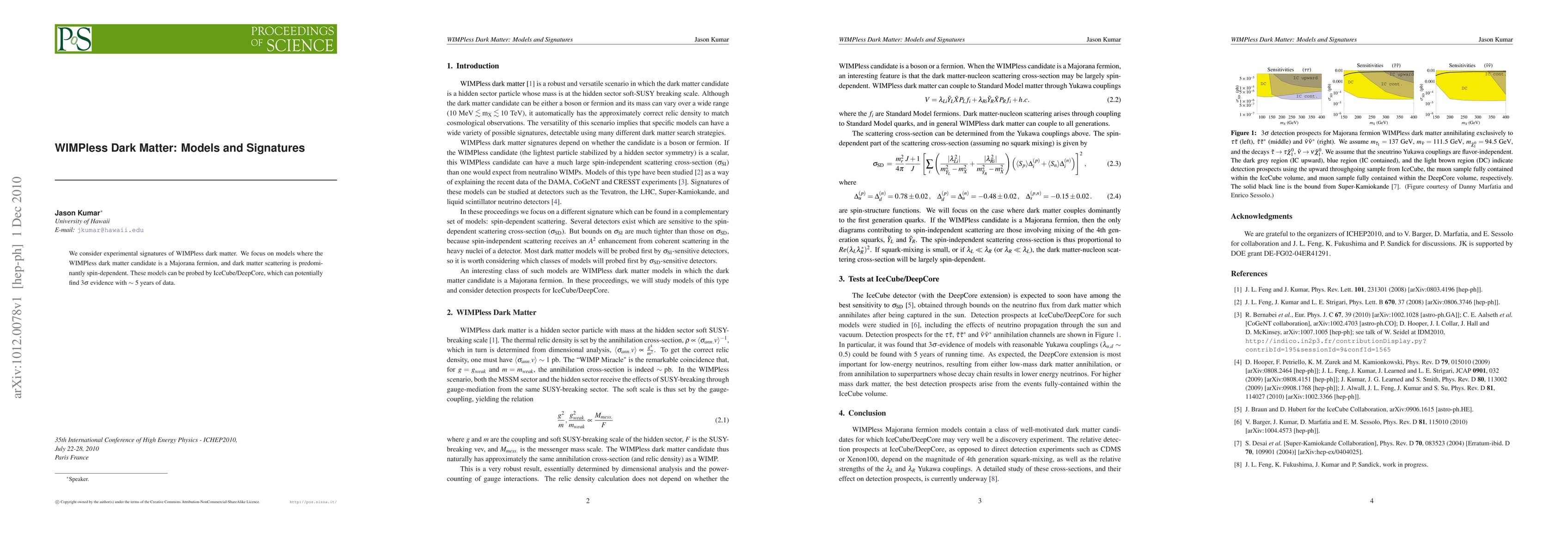 This paper explores experimental signatures of WIMPless dark matter, specifically Majorana fermions with predominantly spin-dependent scattering, and suggests that IceCube/DeepCore could detect $3\sigma$ evidence within approximately five years of data collection.
