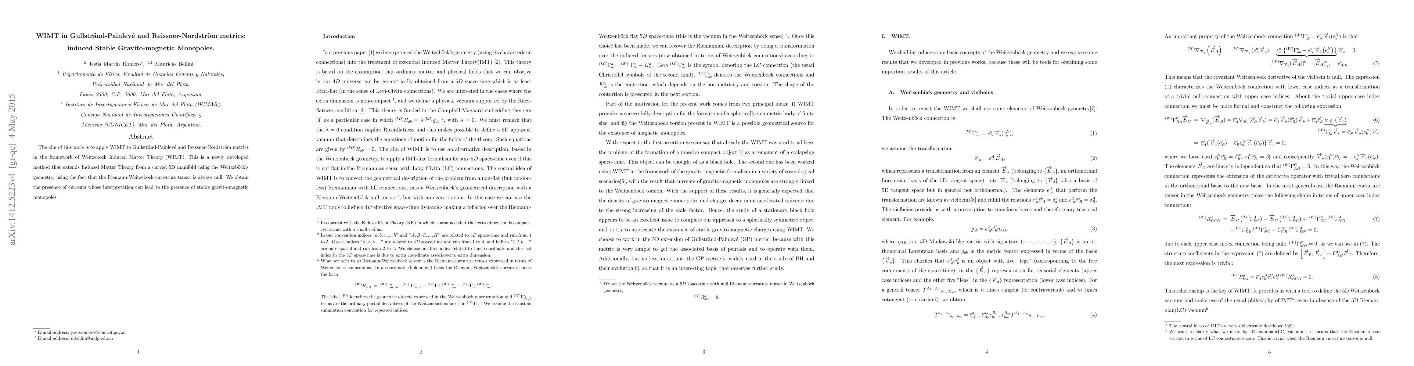 The aim of this work is to apply WIMT to Gullstr\'and-Painlev\'e and Reissner-Nordstr\"om metrics in the framework of Weitzeb\"ock Induced Matter Theory (WIMT). This is a newly developed method that extends Induced Matter Theory from a curved 5D manifold using the Weitzeb\"ock's geometry, using the fact that the Riemann-Weitzeb\"ock curvature tensor is always null. We obtain the presence of currents whose interpretation can lead to the presence of stable gravito-magnetic monopoles.