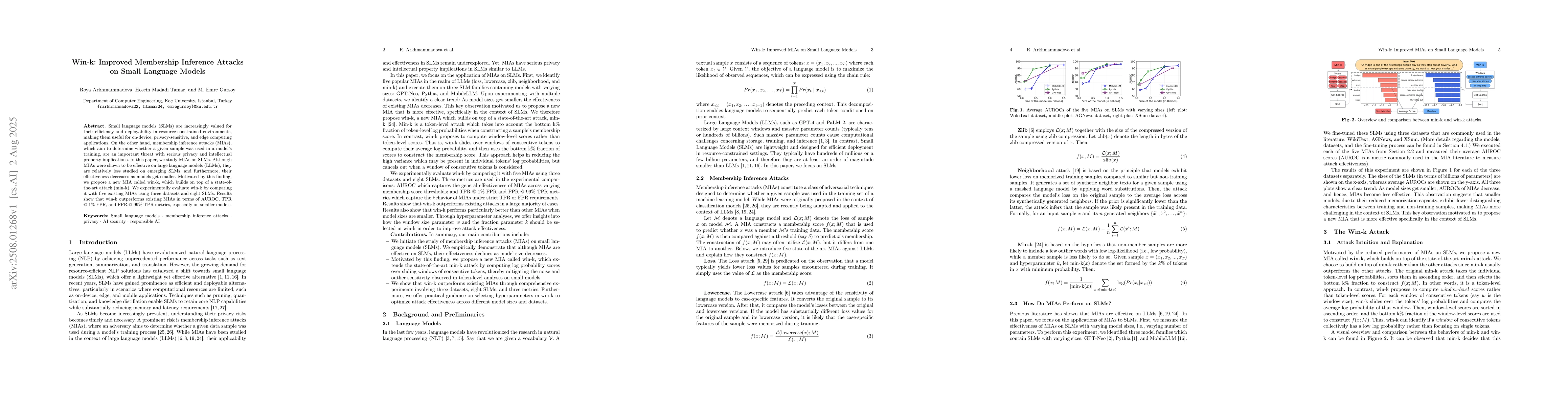 Small language models (SLMs) are increasingly valued for their efficiency and deployability in resource-constrained environments, making them useful for on-device, privacy-sensitive, and edge computing applications. On the other hand, membership inference attacks (MIAs), which aim to determine whether a given sample was used in a model's training, are an important threat with serious privacy and intellectual property implications. In this paper, we study MIAs on SLMs. Although MIAs were shown to be effective on large language models (LLMs), they are relatively less studied on emerging SLMs, and furthermore, their effectiveness decreases as models get smaller. Motivated by this finding, we propose a new MIA called win-k, which builds on top of a state-of-the-art attack (min-k). We experimentally evaluate win-k by comparing it with five existing MIAs using three datasets and eight SLMs. Results show that win-k outperforms existing MIAs in terms of AUROC, TPR @ 1% FPR, and FPR @ 99% TPR metrics, especially on smaller models.