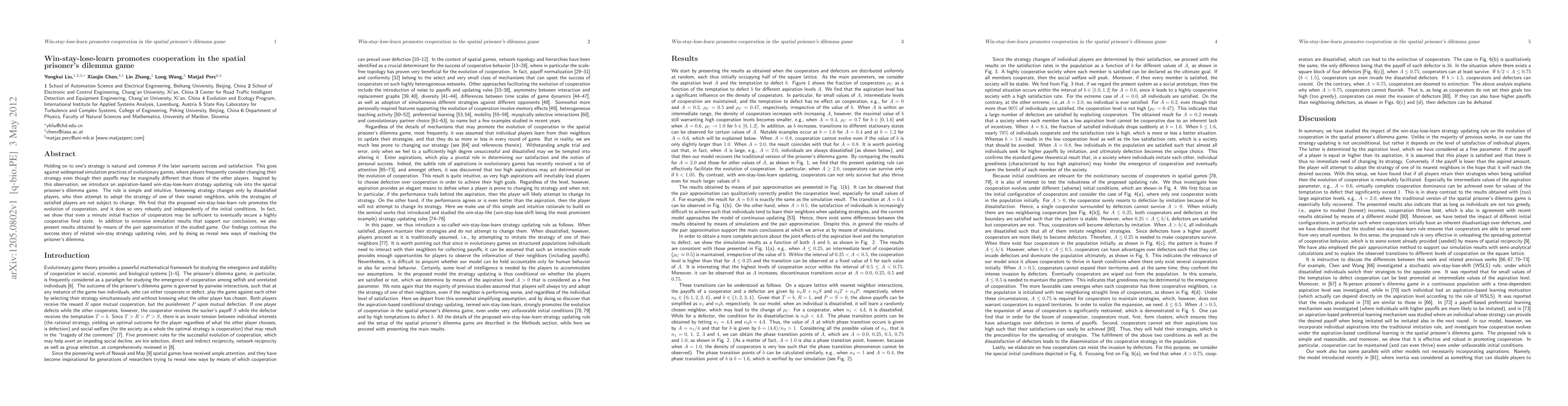 This paper introduces a win-stay-lose-learn strategy to the spatial prisoner's dilemma game, finding that it robustly promotes cooperation, even from a small initial fraction of cooperators. The rule allows satisfied players to maintain their strategy while dissatisfied players adopt the strategy of a neighbor, leading to a highly cooperative final state.