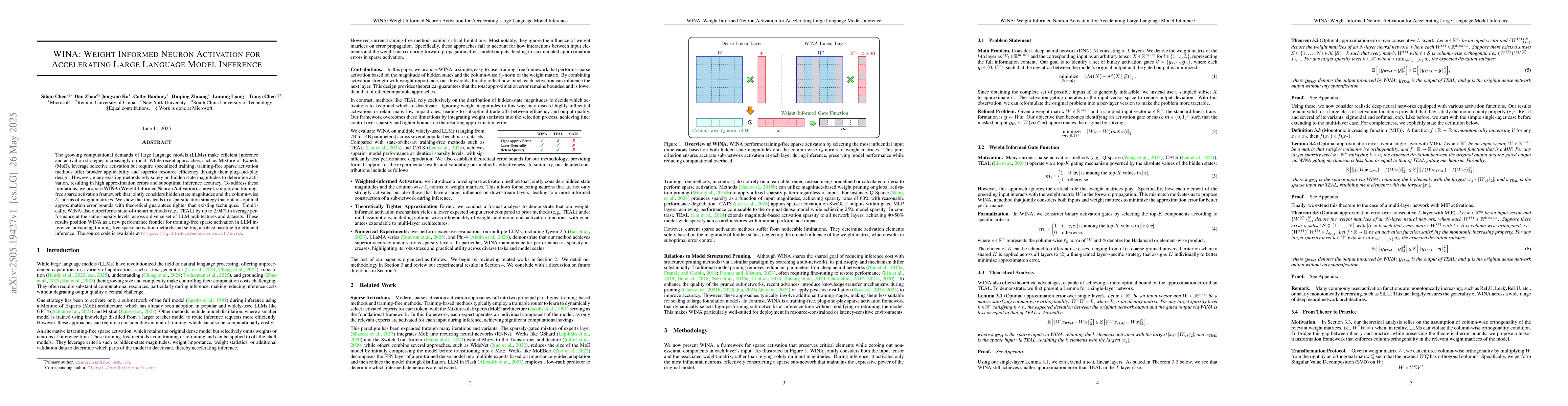 WINA introduces a novel, simple, and training-free sparse activation framework that jointly considers hidden state magnitudes and weight matrix column-wise ℓ2-norms.