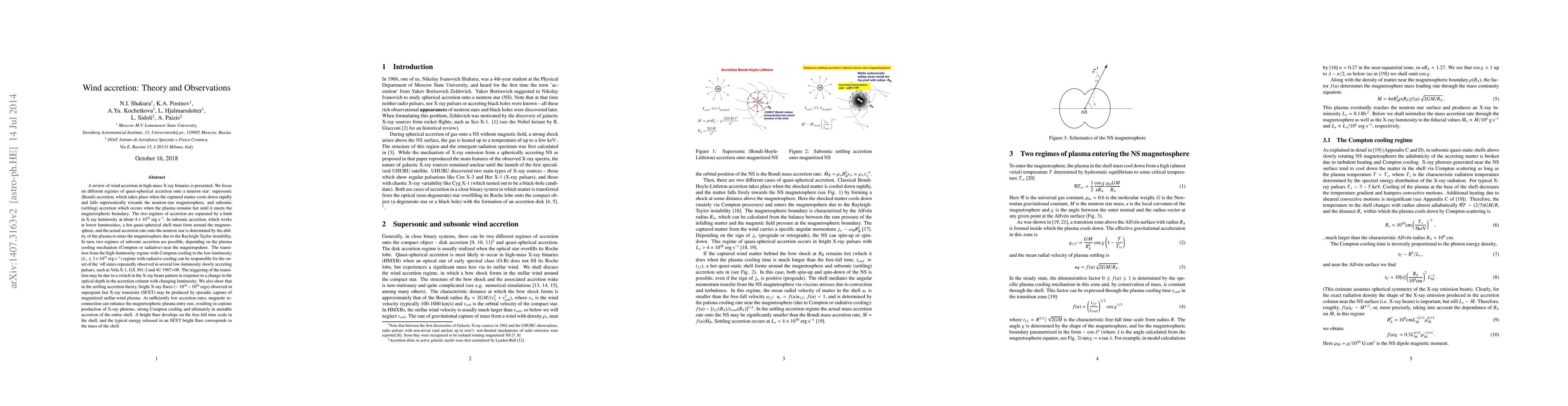 A review of wind accretion in HMXB is presented. We focus on different regimes of quasi-spherical accretion onto a NS: supersonic (Bondi) accretion, which takes place when the captured matter cools down rapidly and falls supersonically towards the NS magnetosphere, and subsonic (settling) accretion which occurs when the plasma remains hot until it meets the magnetospheric boundary. The two regimes are separated by a limit in X-ray luminosity at about 4 10^{36} erg/s. In subsonic accretion, which works a hot quasi-spherical shell must form around the magnetosphere, and the actual accretion rate onto the NS is determined by the ability of the plasma to enter the magnetosphere due to the Rayleigh-Taylor instability. Two regimes of subsonic accretion are possible, depending on the plasma cooling mechanism (Compton or radiative) near the magnetopshere. The transition from the high-luminosity regime with Compton cooling to the low-luminosity (L_x < 3\times 10^35 erg/s) regime with radiative cooling can be responsible for the onset of the 'off' states repeatedly observed in several X-ray pulsars, such as Vela X-1, GX 301-2 and 4U 1907+09. The triggering of the transition may be due to a switch in the X-ray beam pattern in response to a change in the optical depth in the accretion column with changing luminosity. We also show that in the settling accretion theory, bright X-ray flares (10^{38}-10^{40} ergs) observed in SFXT may be produced by sporadic capture of magnetized stellar-wind plasma. At sufficiently low accretion rates, magnetic reconnection can enhance the magnetospheric plasma entry rate, resulting in copious production of X-ray photons, strong Compton cooling and ultimately in unstable accretion of the entire shell. A bright flare develops on the free-fall time scale in the shell, and the typical energy released in an SFXT bright flare corresponds to the mass of the shell.