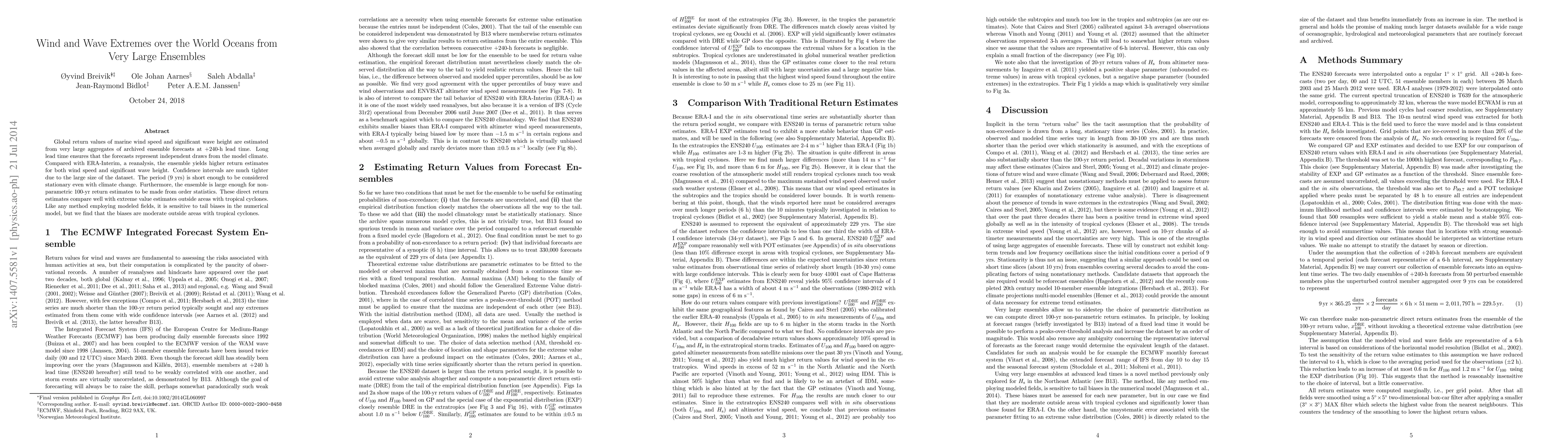 Global return values of marine wind speed and significant wave height are estimated from very large aggregates of archived ensemble forecasts at +240-h lead time. Long lead time ensures that the forecasts represent independent draws from the model climate. Compared with ERA-Interim, a reanalysis, the ensemble yields higher return estimates for both wind speed and significant wave height. Confidence intervals are much tighter due to the large size of the dataset. The period (9 yrs) is short enough to be considered stationary even with climate change. Furthermore, the ensemble is large enough for non-parametric 100-yr return estimates to be made from order statistics. These direct return estimates compare well with extreme value estimates outside areas with tropical cyclones. Like any method employing modeled fields, it is sensitive to tail biases in the numerical model, but we find that the biases are moderate outside areas with tropical cyclones.